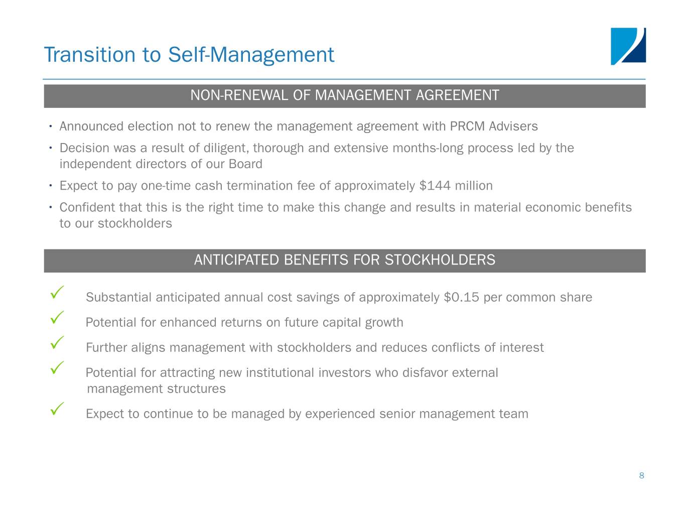 Transition to Self-Management NON-RENEWAL OF MANAGEMENT AGREEMENT • Announced election not to renew the management agreement with PRCM Advisers • Decision was a result of diligent, thorough and extensive months-long process led by the independent directors of our Board • Expect to pay one-time cash termination fee of approximately $144 million • Confident that this is the right time to make this change and results in material economic benefits to our stockholders ANTICIPATED BENEFITS FOR STOCKHOLDERS P Substantial anticipated annual cost savings of approximately $0.15 per common share P Potential for enhanced returns on future capital growth P Further aligns management with stockholders and reduces conflicts of interest P Potential for attracting new institutional investors who disfavor external management structures P Expect to continue to be managed by experienced senior management team 8