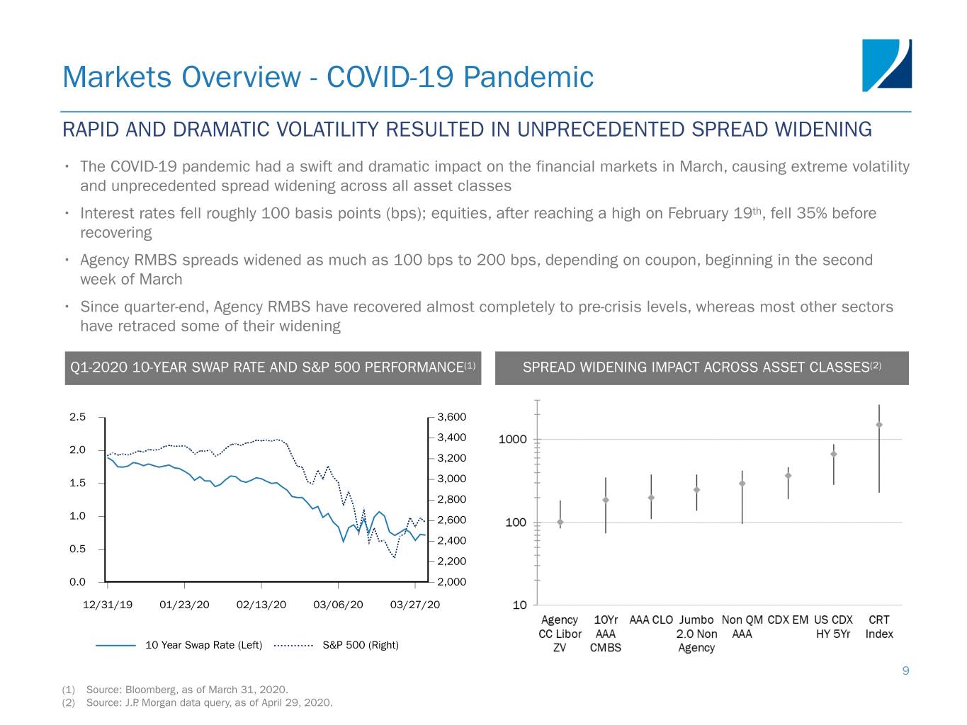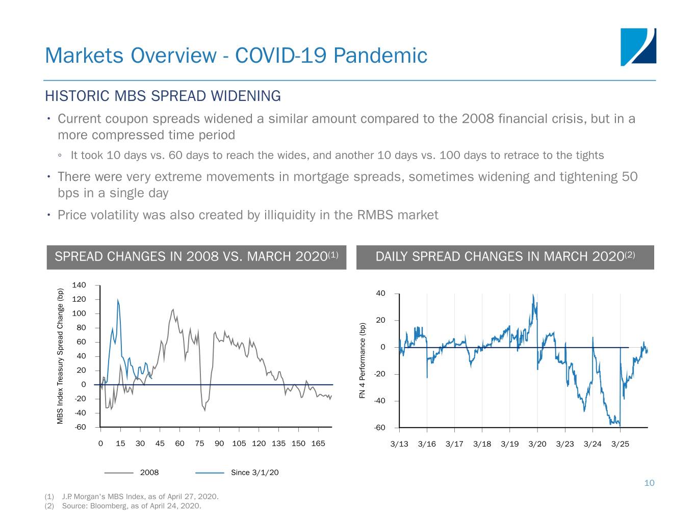 Markets Overview - COVID-19 Pandemic RAPID AND DRAMATIC VOLATILITY RESULTED IN UNPRECEDENTED SPREAD WIDENING • The COVID-19 pandemic had a swift and dramatic impact on the financial markets in March, causing extreme volatility and unprecedented spread widening across all asset classes • Interest rates fell roughly 100 basis points (bps); equities, after reaching a high on February 19th, fell 35% before recovering • Agency RMBS spreads widened as much as 100 bps to 200 bps, depending on coupon, beginning in the second week of March • Since quarter-end, Agency RMBS have recovered almost completely to pre-crisis levels, whereas most other sectors have retraced some of their widening Q1-2020 10-YEAR SWAP RATE AND S&P 500 PERFORMANCE(1) SPREAD WIDENING IMPACT ACROSS ASSET CLASSES(2) 2.5 3,600 3,400 2.0 3,200 1.5 3,000 2,800 1.0 2,600 2,400 0.5 2,200 0.0 2,000 12/31/19 01/23/20 02/13/20 03/06/20 03/27/20 10 Year Swap Rate (Left) S&P 500 (Right) 9 (1) Source: Bloomberg, as of March 31, 2020. (2) Source: J.P. Morgan data query, as of April 29, 2020.