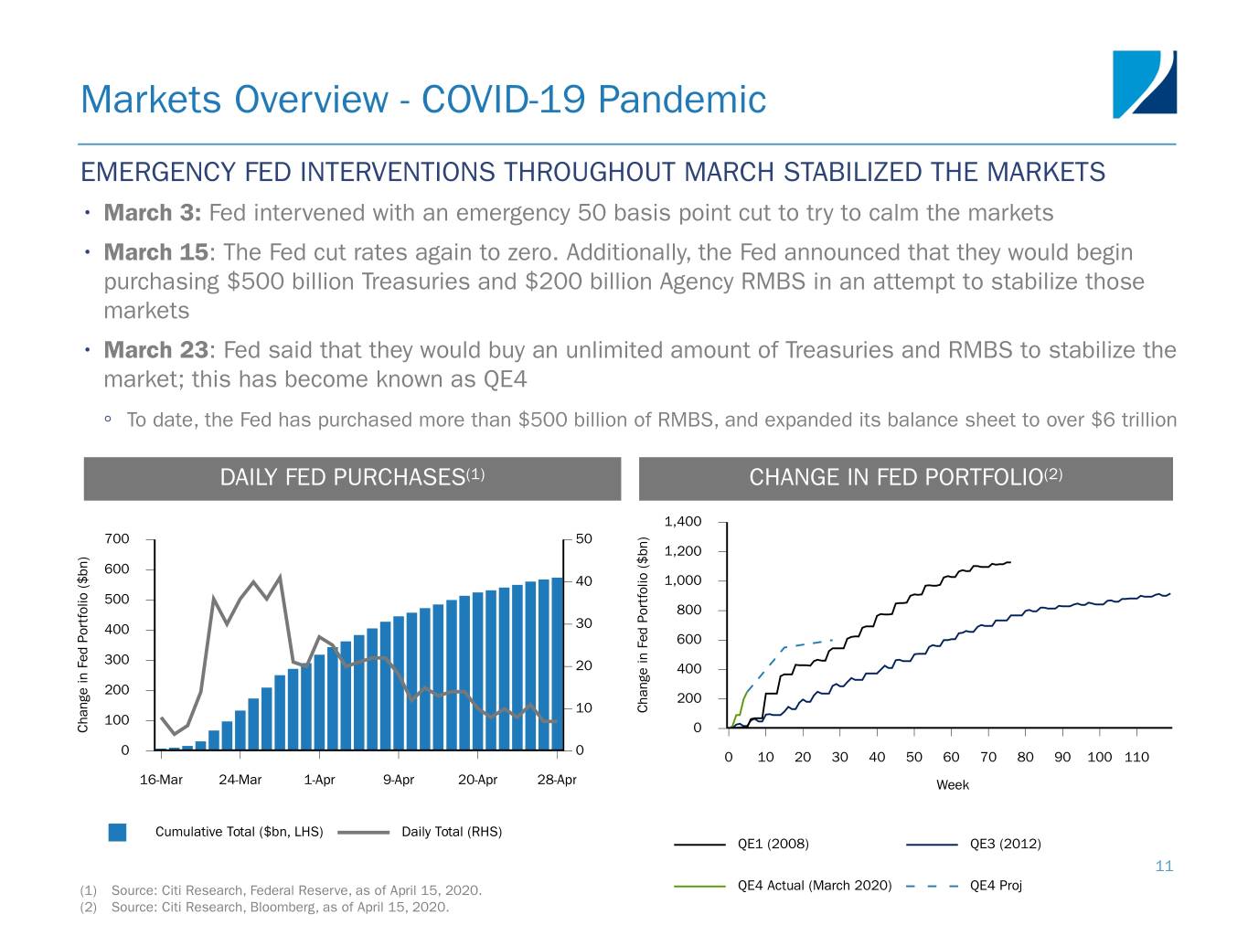 Markets Overview - COVID-19 Pandemic EMERGENCY FED INTERVENTIONS THROUGHOUT MARCH STABILIZED THE MARKETS • March 3: Fed intervened with an emergency 50 basis point cut to try to calm the markets • March 15: The Fed cut rates again to zero. Additionally, the Fed announced that they would begin purchasing $500 billion Treasuries and $200 billion Agency RMBS in an attempt to stabilize those markets • March 23: Fed said that they would buy an unlimited amount of Treasuries and RMBS to stabilize the market; this has become known as QE4 ◦ To date, the Fed has purchased more than $500 billion of RMBS, and expanded its balance sheet to over $6 trillion DAILY FED PURCHASES(1) CHANGE IN FED PORTFOLIO(2) 1,400 700 50 ) n b 1,200 ) $ n ( b 600 o i $ 40 l 1,000 ( o f o t i 500 l r o o 800 f P t r 30 d o 400 e P 600 F d n e 300 i F 20 e 400 n g i n e 200 a g h 200 n 10 C a h 100 C 0 0 0 0 10 20 30 40 50 60 70 80 90 100 110 16-Mar 24-Mar 1-Apr 9-Apr 20-Apr 28-Apr Week Cumulative Total ($bn, LHS) Daily Total (RHS) QE1 (2008) QE3 (2012) 11 (1) Source: Citi Research, Federal Reserve, as of April 15, 2020. QE4 Actual (March 2020) QE4 Proj (2) Source: Citi Research, Bloomberg, as of April 15, 2020.