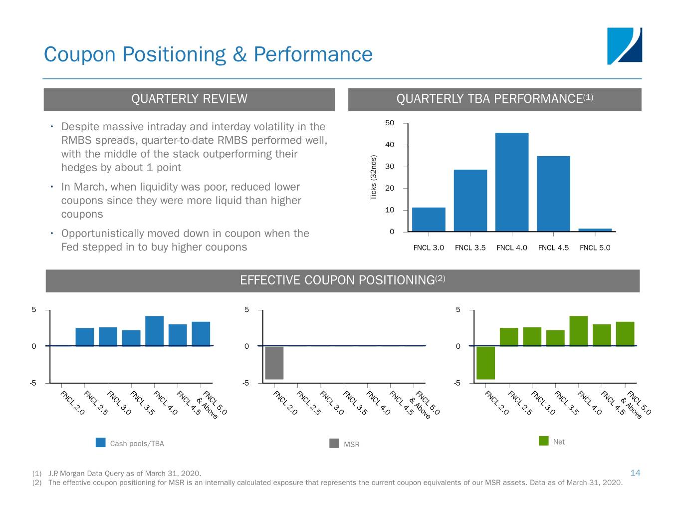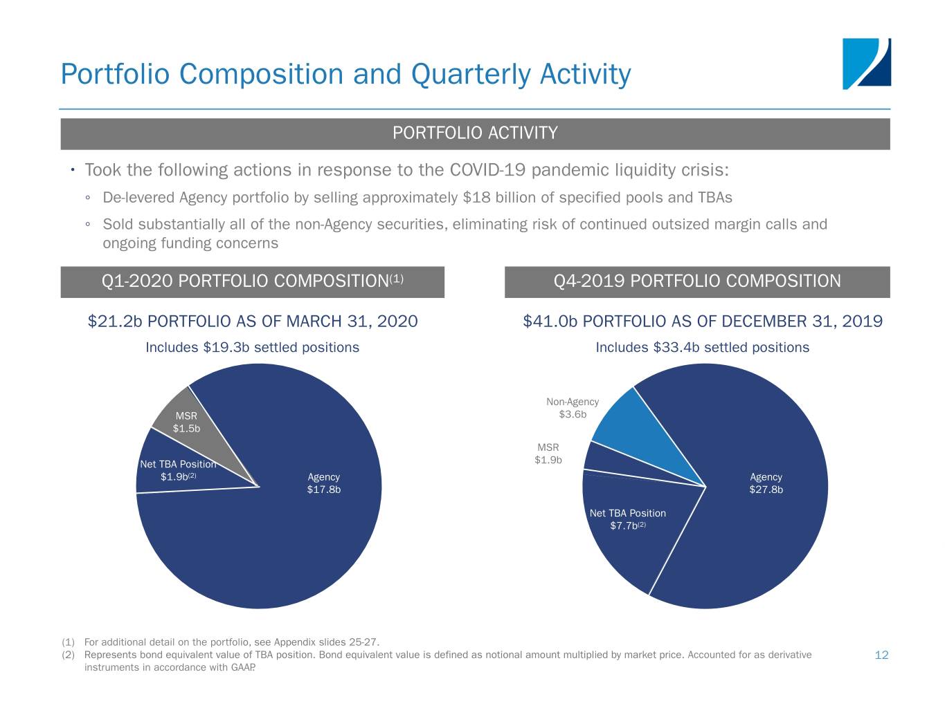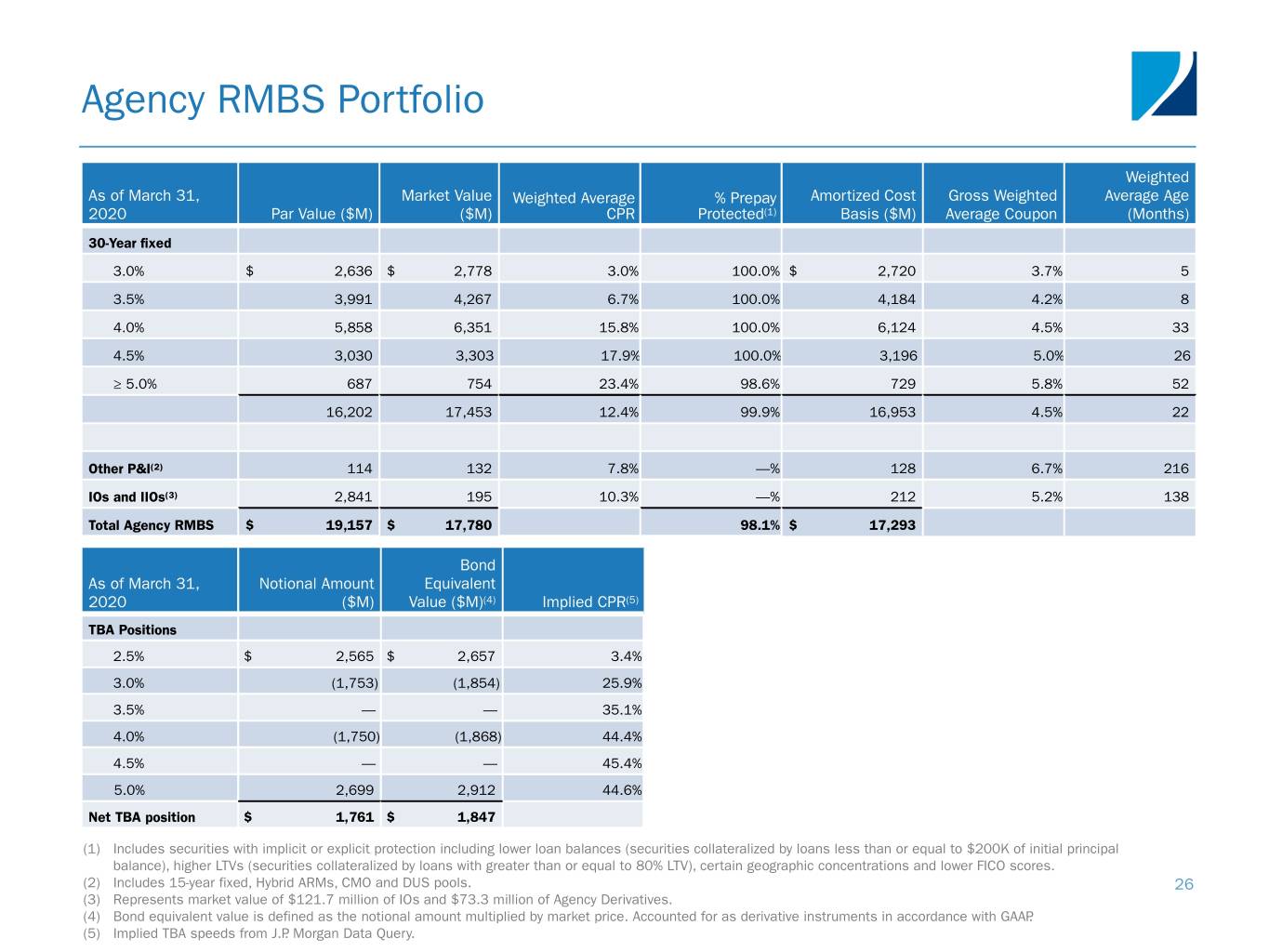 Agency RMBS Portfolio Weighted As of March 31, Market Value Weighted Average % Prepay Amortized Cost Gross Weighted Average Age 2020 Par Value ($M) ($M) CPR Protected(1) Basis ($M) Average Coupon (Months) 30-Year fixed 3.0% $ 2,636 $ 2,778 3.0% 100.0% $ 2,720 3.7% 5 3.5% 3,991 4,267 6.7% 100.0% 4,184 4.2% 8 4.0% 5,858 6,351 15.8% 100.0% 6,124 4.5% 33 4.5% 3,030 3,303 17.9% 100.0% 3,196 5.0% 26 ≥ 5.0% 687 754 23.4% 98.6% 729 5.8% 52 16,202 17,453 12.4% 99.9% 16,953 4.5% 22 Other P&I(2) 114 132 7.8% —% 128 6.7% 216 IOs and IIOs(3) 2,841 195 10.3% —% 212 5.2% 138 Total Agency RMBS $ 19,157 $ 17,780 98.1% $ 17,293 Bond As of March 31, Notional Amount Equivalent 2020 ($M) Value ($M)(4) Implied CPR(5) TBA Positions 2.5% $ 2,565 $ 2,657 3.4% 3.0% (1,753) (1,854) 25.9% 3.5% — — 35.1% 4.0% (1,750) (1,868) 44.4% 4.5% — — 45.4% 5.0% 2,699 2,912 44.6% Net TBA position $ 1,761 $ 1,847 (1) Includes securities with implicit or explicit protection including lower loan balances (securities collateralized by loans less than or equal to $200K of initial principal balance), higher LTVs (securities collateralized by loans with greater than or equal to 80% LTV), certain geographic concentrations and lower FICO scores. (2) Includes 15-year fixed, Hybrid ARMs, CMO and DUS pools. 26 (3) Represents market value of $121.7 million of IOs and $73.3 million of Agency Derivatives. (4) Bond equivalent value is defined as the notional amount multiplied by market price. Accounted for as derivative instruments in accordance with GAAP. (5) Implied TBA speeds from J.P. Morgan Data Query.