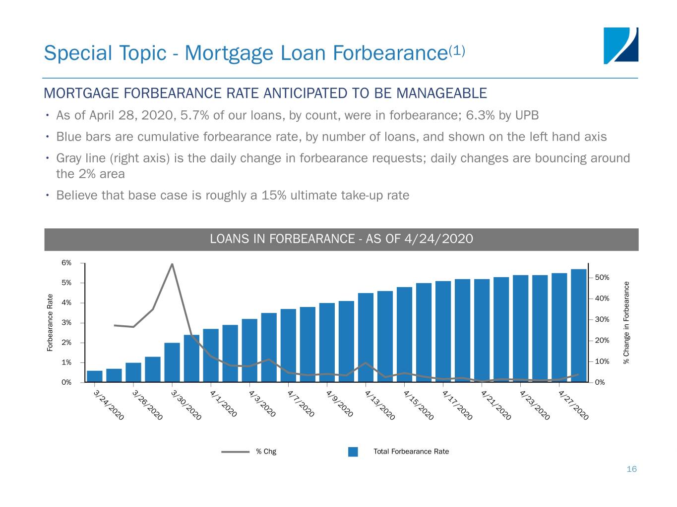 Special Topic - Mortgage Loan Forbearance(1) MORTGAGE FORBEARANCE RATE ANTICIPATED TO BE MANAGEABLE • As of April 28, 2020, 5.7% of our loans, by count, were in forbearance; 6.3% by UPB • Blue bars are cumulative forbearance rate, by number of loans, and shown on the left hand axis • Gray line (right axis) is the daily change in forbearance requests; daily changes are bouncing around the 2% area • Believe that base case is roughly a 15% ultimate take-up rate LOANS IN FORBEARANCE - AS OF 4/24/2020 6% 50% 5% e c n a e r t 40% a a 4% e R b r e o c F n 3% 30% a n r i a e e g b n r 2% 20% a o F h C 1% 10% % 0% 0% 3 3 3 4 4 4 4 4 4 4 4 4 4 / / / / / / / / / / / / / 2 2 3 1 3 7 9 1 1 1 2 2 2 4 6 0 / / / / 3 5 7 1 3 7 / / / 2 2 2 2 / / / / / / 2 2 2 0 0 0 0 2 2 2 2 2 2 0 0 0 2 2 2 2 0 0 0 0 0 0 2 2 2 0 0 0 0 2 2 2 2 2 2 0 0 0 0 0 0 0 0 0 % Chg Total Forbearance Rate 16