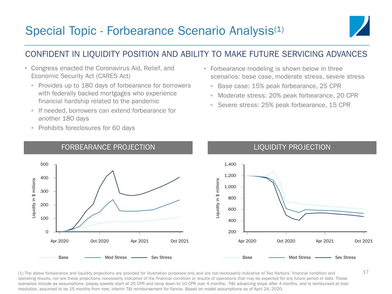 Risk Positioning LOW RISK EXPOSURES COMMON BOOK VALUE EXPOSURE TO CHANGES IN SPREADS(1) • Exposure to mortgage spreads and interest 12% rates remains small e 8% u l a 4.2% v 3.2% k 4% 1.7% • In a 25 bps spread widening, potential book o o b n 0% value decrease of 1.4% i e g n -4% (1.4%) a (2.5%) • In a 50 bps instantaneous parallel shift h c (4.6%) upward in interest rates, potential book value % -8% decrease of 1.3% -12% Down 25 0 Up 25 Agency RMBS MSR Combined COMMON BOOK VALUE EXPOSURE TO CHANGES IN RATES(2) 20% 13.7% e u 15% l a v 10% 7.5% 6.7% k o 3.6% 4.0% o 5% 1.8% b n i 0% e g n (1.0%) (0.5%) (0.4%) a -5% (2.5%) (1.3%) h c (4.6%) -10% (6.3%) (5.2%) % (9.8%) -15% (12.1%) Down 50 Down 25 0 Up 25 Up 50 RMBS MSR All Hedges(3) Combined Note: Sensitivity data as of March 31, 2020. The above spread scenario is provided for illustration purposes only and is not necessarily indicative of Two Harbors’ financial condition and operating results, nor is it necessarily indicative of the financial condition or results of operations that may be expected for any future period or date. (1) The information presented in this chart projects the potential impact on common book value of instantaneous changes in current coupon mortgage spreads. Spread sensitivity is 15 based on results from third party models in conjunction with inputs from our internal investment professionals. Actual results could differ materially from these estimates. (2) Represents estimated change in common book value for theoretical parallel shift in interest rates. (3) All hedges includes derivative assets and liabilities and all borrowings. All Hedges excludes Agency derivatives, which are included in the RMBS category.