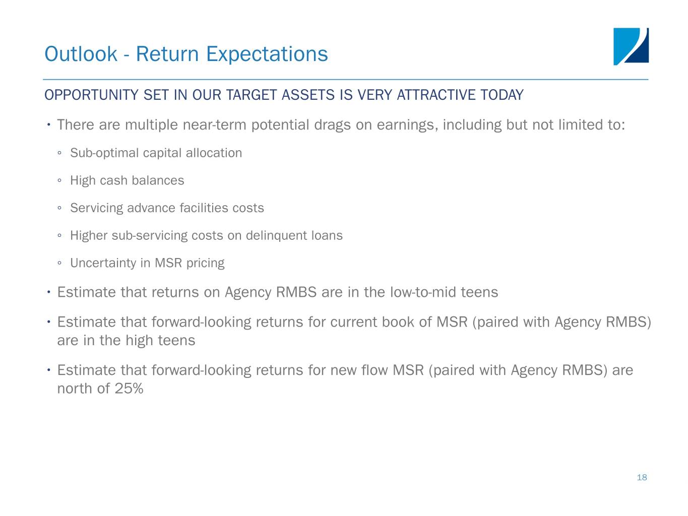 Outlook - Return Expectations OPPORTUNITY SET IN OUR TARGET ASSETS IS VERY ATTRACTIVE TODAY • There are multiple near-term potential drags on earnings, including but not limited to: ◦ Sub-optimal capital allocation ◦ High cash balances ◦ Servicing advance facilities costs ◦ Higher sub-servicing costs on delinquent loans ◦ Uncertainty in MSR pricing • Estimate that returns on Agency RMBS are in the low-to-mid teens • Estimate that forward-looking returns for current book of MSR (paired with Agency RMBS) are in the high teens • Estimate that forward-looking returns for new flow MSR (paired with Agency RMBS) are north of 25% 18