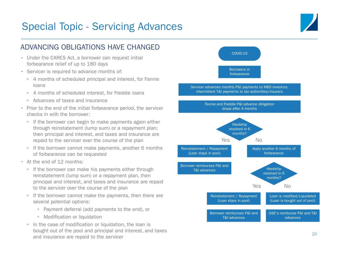 Special Topic - Servicing Advances ADVANCING OBLIGATIONS HAVE CHANGED COVID-19 • Under the CARES Act, a borrower can request initial forbearance relief of up to 180 days Borrowers in • Servicer is required to advance months of: forbearance ◦ 4 months of scheduled principal and interest, for Fannie loans Servicer advances monthly P&I payments to MBS investors, ◦ 4 months of scheduled interest, for Freddie loans intermittent T&I payments to tax authorities/insurers ◦ Advances of taxes and insurance Fannie and Freddie P&I advance obligation • Prior to the end of the initial forbearance period, the servicer drops after 4 months checks in with the borrower: ◦ If the borrower can begin to make payments again either Hardship through reinstatement (lump sum) or a repayment plan; resolved in 6 then principal and interest, and taxes and insurance are months? repaid to the servicer over the course of the plan Yes No ◦ If the borrower cannot make payments, another 6 months Reinstatement / Repayment Apply another 6 months of of forbearance can be requested (Loan stays in pool) forbearance • At the end of 12 months: Borrower reimburses P&I and ◦ If the borrower can make his payments either through T&I advances Hardship resolved in 6 reinstatement (lump sum) or a repayment plan, then months? principal and interest, and taxes and insurance are repaid to the servicer over the course of the plan Yes No ◦ If the borrower cannot make the payments, then there are Reinstatement / Repayment Loan is modified/Liquidated several potential options: (Loan stays in pool) (Loan is bought out of pool) ◦ Payment deferral (add payments to the end), or Borrower reimburses P&I and GSE's reimburse P&I and T&I ◦ Modification or liquidation T&I advances advances ◦ In the case of modification or liquidation, the loan is bought out of the pool and principal and interest, and taxes 20 and insurance are repaid to the servicer