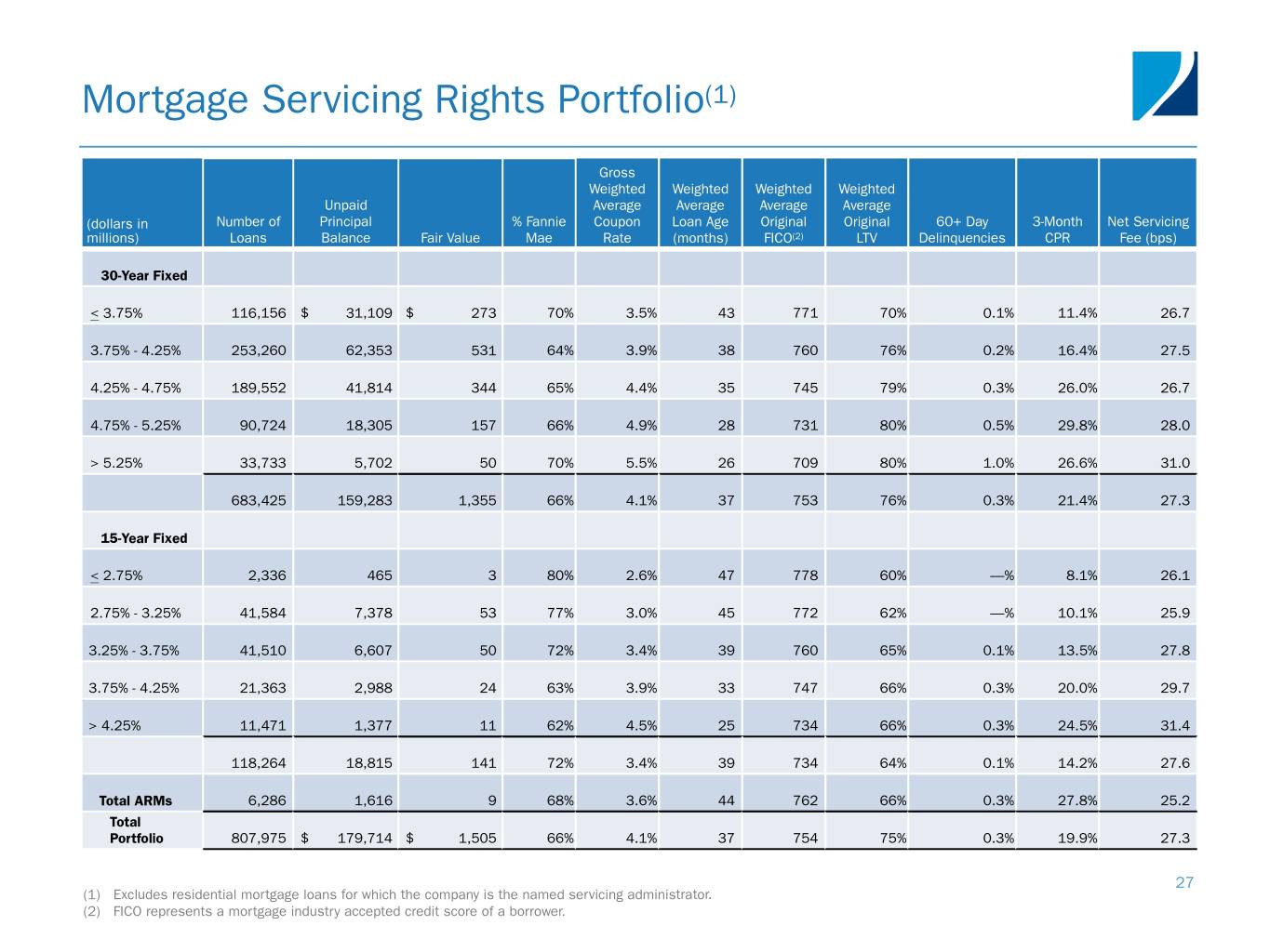 Mortgage Servicing Rights Portfolio(1) Gross Weighted Weighted Weighted Weighted Unpaid Average Average Average Average (dollars in Number of Principal % Fannie Coupon Loan Age Original Original 60+ Day 3-Month Net Servicing millions) Loans Balance Fair Value Mae Rate (months) FICO(2) LTV Delinquencies CPR Fee (bps) 30-Year Fixed < 3.75% 116,156 $ 31,109 $ 273 70% 3.5% 43 771 70% 0.1% 11.4% 26.7 3.75% - 4.25% 253,260 62,353 531 64% 3.9% 38 760 76% 0.2% 16.4% 27.5 4.25% - 4.75% 189,552 41,814 344 65% 4.4% 35 745 79% 0.3% 26.0% 26.7 4.75% - 5.25% 90,724 18,305 157 66% 4.9% 28 731 80% 0.5% 29.8% 28.0 > 5.25% 33,733 5,702 50 70% 5.5% 26 709 80% 1.0% 26.6% 31.0 683,425 159,283 1,355 66% 4.1% 37 753 76% 0.3% 21.4% 27.3 15-Year Fixed < 2.75% 2,336 465 3 80% 2.6% 47 778 60% —% 8.1% 26.1 2.75% - 3.25% 41,584 7,378 53 77% 3.0% 45 772 62% —% 10.1% 25.9 3.25% - 3.75% 41,510 6,607 50 72% 3.4% 39 760 65% 0.1% 13.5% 27.8 3.75% - 4.25% 21,363 2,988 24 63% 3.9% 33 747 66% 0.3% 20.0% 29.7 > 4.25% 11,471 1,377 11 62% 4.5% 25 734 66% 0.3% 24.5% 31.4 118,264 18,815 141 72% 3.4% 39 734 64% 0.1% 14.2% 27.6 Total ARMs 6,286 1,616 9 68% 3.6% 44 762 66% 0.3% 27.8% 25.2 Total Portfolio 807,975 $ 179,714 $ 1,505 66% 4.1% 37 754 75% 0.3% 19.9% 27.3 27 (1) Excludes residential mortgage loans for which the company is the named servicing administrator. (2) FICO represents a mortgage industry accepted credit score of a borrower.