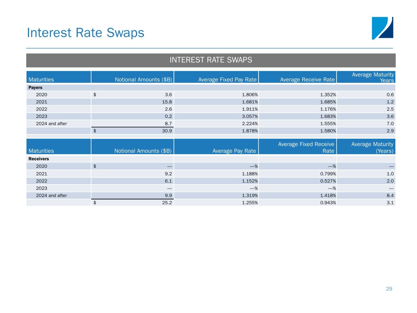 Interest Rate Swaps INTEREST RATE SWAPS Average Maturity Maturities Notional Amounts ($B) Average Fixed Pay Rate Average Receive Rate Years Payers 2020 $ 3.6 1.806% 1.352% 0.6 2021 15.8 1.681% 1.685% 1.2 2022 2.6 1.911% 1.176% 2.5 2023 0.2 3.057% 1.683% 3.6 2024 and after 8.7 2.224% 1.555% 7.0 $ 30.9 1.878% 1.580% 2.9 Average Fixed Receive Average Maturity Maturities Notional Amounts ($B) Average Pay Rate Rate (Years) Receivers 2020 $ — —% —% — 2021 9.2 1.188% 0.799% 1.0 2022 6.1 1.152% 0.527% 2.0 2023 — —% —% — 2024 and after 9.9 1.319% 1.418% 8.4 $ 25.2 1.255% 0.943% 3.1 29