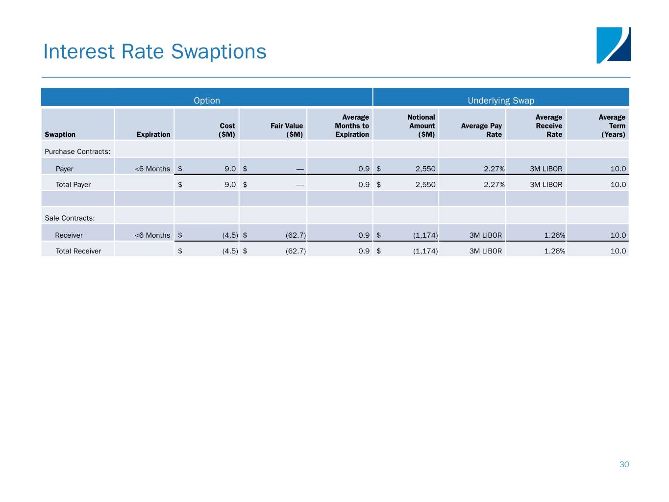 Interest Rate Swaptions Option Underlying Swap Average Notional Average Average Cost Fair Value Months to Amount Average Pay Receive Term Swaption Expiration ($M) ($M) Expiration ($M) Rate Rate (Years) Purchase Contracts: Payer <6 Months $ 9.0 $ — 0.9 $ 2,550 2.27% 3M LIBOR 10.0 Total Payer $ 9.0 $ — 0.9 $ 2,550 2.27% 3M LIBOR 10.0 Sale Contracts: Receiver <6 Months $ (4.5) $ (62.7) 0.9 $ (1,174) 3M LIBOR 1.26% 10.0 Total Receiver $ (4.5) $ (62.7) 0.9 $ (1,174) 3M LIBOR 1.26% 10.0 30
