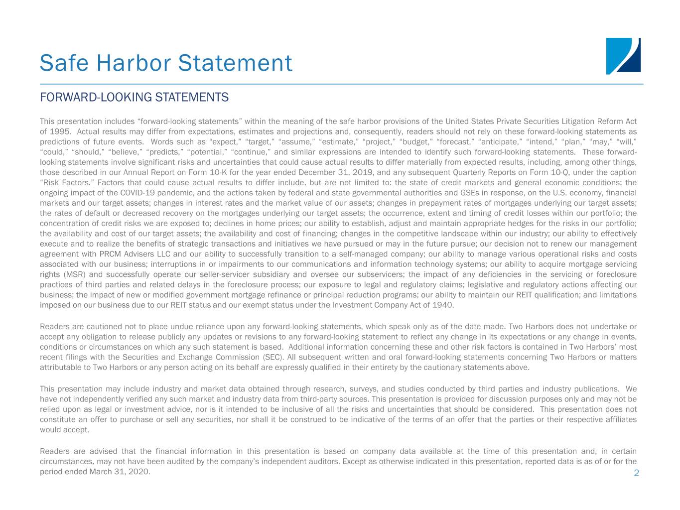 Safe Harbor Statement FORWARD-LOOKING STATEMENTS This presentation includes “forward-looking statements” within the meaning of the safe harbor provisions of the United States Private Securities Litigation Reform Act of 1995. Actual results may differ from expectations, estimates and projections and, consequently, readers should not rely on these forward-looking statements as predictions of future events. Words such as “expect,” “target,” “assume,” “estimate,” “project,” “budget,” “forecast,” “anticipate,” “intend,” “plan,” “may,” “will,” “could,” “should,” “believe,” “predicts,” “potential,” “continue,” and similar expressions are intended to identify such forward-looking statements. These forward- looking statements involve significant risks and uncertainties that could cause actual results to differ materially from expected results, including, among other things, those described in our Annual Report on Form 10-K for the year ended December 31, 2019, and any subsequent Quarterly Reports on Form 10-Q, under the caption “Risk Factors.” Factors that could cause actual results to differ include, but are not limited to: the state of credit markets and general economic conditions; the ongoing impact of the COVID-19 pandemic, and the actions taken by federal and state governmental authorities and GSEs in response, on the U.S. economy, financial markets and our target assets; changes in interest rates and the market value of our assets; changes in prepayment rates of mortgages underlying our target assets; the rates of default or decreased recovery on the mortgages underlying our target assets; the occurrence, extent and timing of credit losses within our portfolio; the concentration of credit risks we are exposed to; declines in home prices; our ability to establish, adjust and maintain appropriate hedges for the risks in our portfolio; the availability and cost of our target assets; the availability and cost of financing; changes in the competitive landscape within our industry; our ability to effectively execute and to realize the benefits of strategic transactions and initiatives we have pursued or may in the future pursue; our decision not to renew our management agreement with PRCM Advisers LLC and our ability to successfully transition to a self-managed company; our ability to manage various operational risks and costs associated with our business; interruptions in or impairments to our communications and information technology systems; our ability to acquire mortgage servicing rights (MSR) and successfully operate our seller-servicer subsidiary and oversee our subservicers; the impact of any deficiencies in the servicing or foreclosure practices of third parties and related delays in the foreclosure process; our exposure to legal and regulatory claims; legislative and regulatory actions affecting our business; the impact of new or modified government mortgage refinance or principal reduction programs; our ability to maintain our REIT qualification; and limitations imposed on our business due to our REIT status and our exempt status under the Investment Company Act of 1940. Readers are cautioned not to place undue reliance upon any forward-looking statements, which speak only as of the date made. Two Harbors does not undertake or accept any obligation to release publicly any updates or revisions to any forward-looking statement to reflect any change in its expectations or any change in events, conditions or circumstances on which any such statement is based. Additional information concerning these and other risk factors is contained in Two Harbors’ most recent filings with the Securities and Exchange Commission (SEC). All subsequent written and oral forward-looking statements concerning Two Harbors or matters attributable to Two Harbors or any person acting on its behalf are expressly qualified in their entirety by the cautionary statements above. This presentation may include industry and market data obtained through research, surveys, and studies conducted by third parties and industry publications. We have not independently verified any such market and industry data from third-party sources. This presentation is provided for discussion purposes only and may not be relied upon as legal or investment advice, nor is it intended to be inclusive of all the risks and uncertainties that should be considered. This presentation does not constitute an offer to purchase or sell any securities, nor shall it be construed to be indicative of the terms of an offer that the parties or their respective affiliates would accept. Readers are advised that the financial information in this presentation is based on company data available at the time of this presentation and, in certain circumstances, may not have been audited by the company’s independent auditors. Except as otherwise indicated in this presentation, reported data is as of or for the period ended March 31, 2020. 2