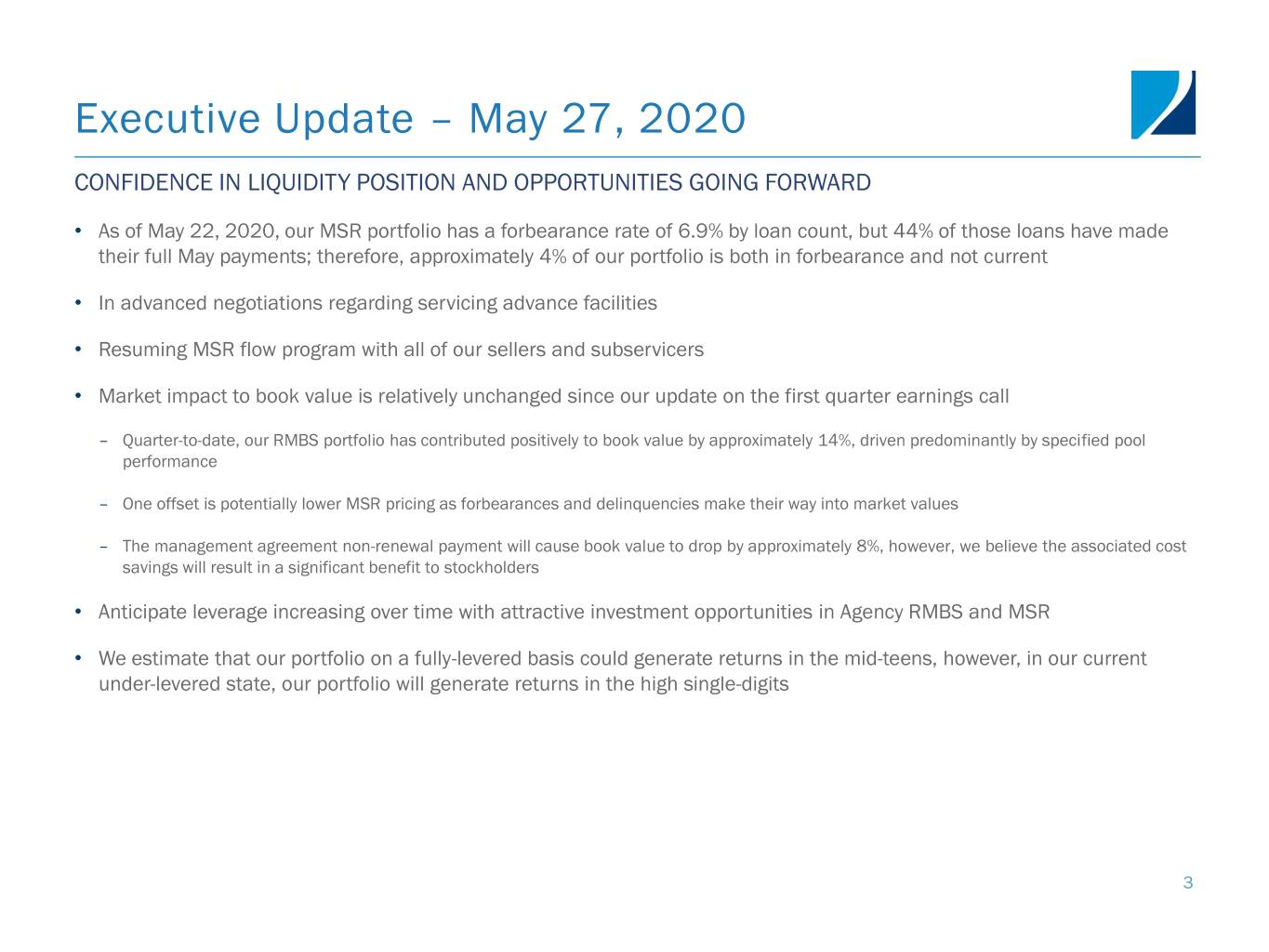 Executive Update – May 27, 2020 CONFIDENCE IN LIQUIDITY POSITION AND OPPORTUNITIES GOING FORWARD • As of May 22, 2020, our MSR portfolio has a forbearance rate of 6.9% by loan count, but 44% of those loans have made their full May payments; therefore, approximately 4% of our portfolio is both in forbearance and not current • In advanced negotiations regarding servicing advance facilities • Resuming MSR flow program with all of our sellers and subservicers • Market impact to book value is relatively unchanged since our update on the first quarter earnings call – Quarter-to-date, our RMBS portfolio has contributed positively to book value by approximately 14%, driven predominantly by specified pool performance – One offset is potentially lower MSR pricing as forbearances and delinquencies make their way into market values – The management agreement non-renewal payment will cause book value to drop by approximately 8%, however, we believe the associated cost savings will result in a significant benefit to stockholders • Anticipate leverage increasing over time with attractive investment opportunities in Agency RMBS and MSR • We estimate that our portfolio on a fully-levered basis could generate returns in the mid-teens, however, in our current under-levered state, our portfolio will generate returns in the high single-digits 3