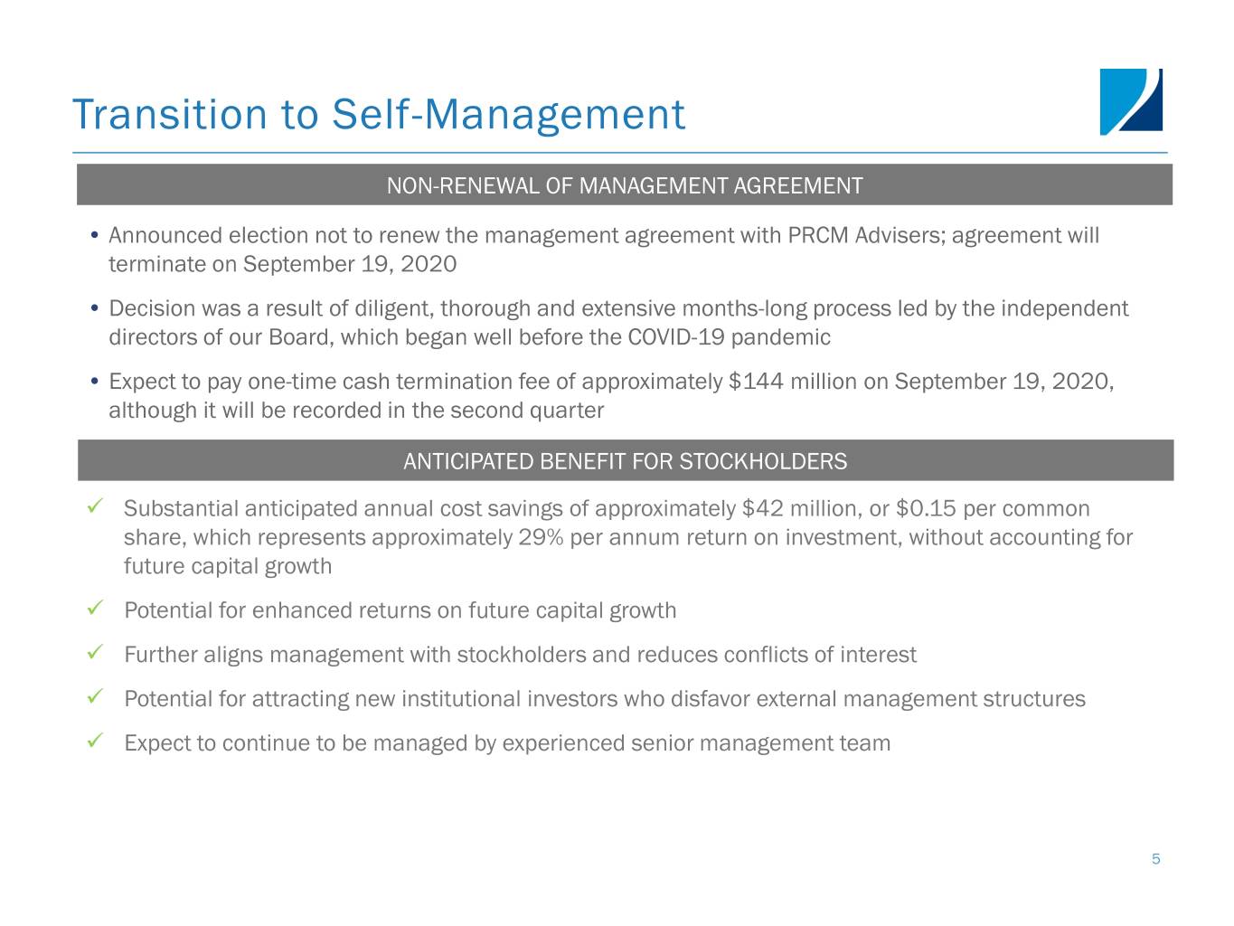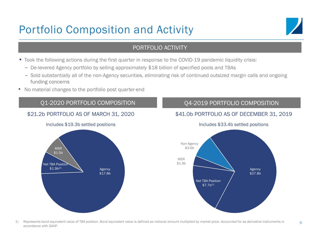 Transition to Self-Management NON-RENEWAL OF MANAGEMENT AGREEMENT • Announced election not to renew the management agreement with PRCM Advisers; agreement will terminate on September 19, 2020 • Decision was a result of diligent, thorough and extensive months-long process led by the independent directors of our Board, which began well before the COVID-19 pandemic • Expect to pay one-time cash termination fee of approximately $144 million on September 19, 2020, although it will be recorded in the second quarter ANTICIPATED BENEFIT FOR STOCKHOLDERS Substantial anticipated annual cost savings of approximately $42 million, or $0.15 per common share, which represents approximately 29% per annum return on investment, without accounting for future capital growth Potential for enhanced returns on future capital growth Further aligns management with stockholders and reduces conflicts of interest Potential for attracting new institutional investors who disfavor external management structures Expect to continue to be managed by experienced senior management team 5