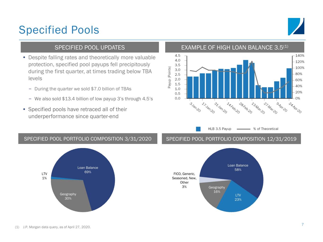 Portfolio Composition and Activity PORTFOLIO ACTIVITY • Took the following actions during the first quarter in response to the COVID-19 pandemic liquidity crisis: – De-levered Agency portfolio by selling approximately $18 billion of specified pools and TBAs – Sold substantially all of the non-Agency securities, eliminating risk of continued outsized margin calls and ongoing funding concerns • No material changes to the portfolio post quarter-end Q1-2020 PORTFOLIO COMPOSITION Q4-2019 PORTFOLIO COMPOSITION $21.2b PORTFOLIO AS OF MARCH 31, 2020 $41.0b PORTFOLIO AS OF DECEMBER 31, 2019 Includes $19.3b settled positions Includes $33.4b settled positions Non-Agency MSR $3.6b $1.5b MSR Net TBA Position $1.9b $1.9b(2) Agency Agency $17.8b $27.8b Net TBA Position $7.7b(1) 1) Represents bond equivalent value of TBA position. Bond equivalent value is defined as notional amount multiplied by market price. Accounted for as derivative instruments in 6 accordance with GAAP.