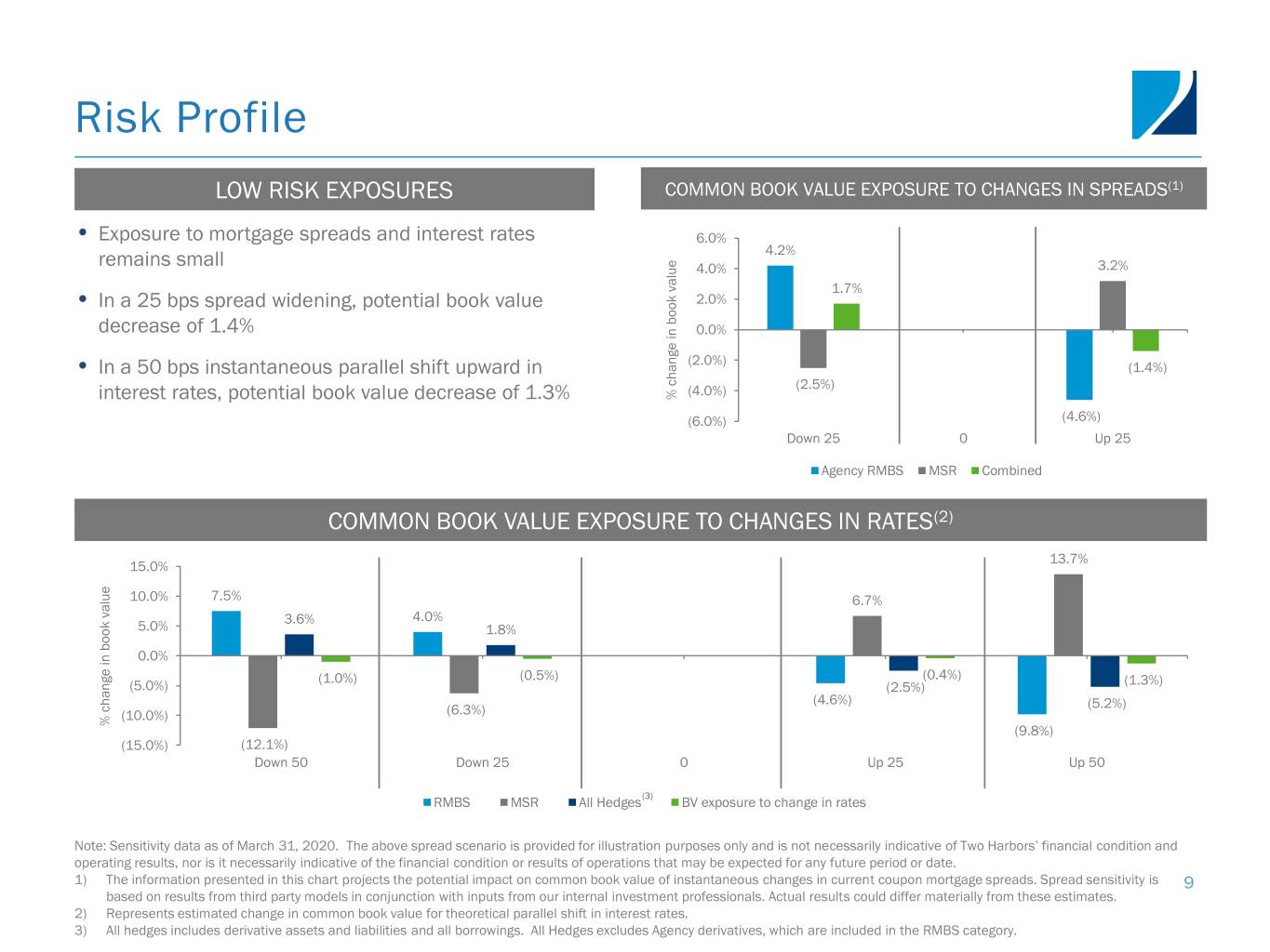 Risk Profile LOW RISK EXPOSURES COMMON BOOK VALUE EXPOSURE TO CHANGES IN SPREADS(1) • Exposure to mortgage spreads and interest rates 6.0% 4.2% remains small 4.0% 3.2% 1.7% • In a 25 bps spread widening, potential book value 2.0% decrease of 1.4% 0.0% (2.0%) • In a 50 bps instantaneous parallel shift upward in (1.4%) (4.0%) (2.5%) interest rates, potential book value decrease of 1.3% value bookin change % (6.0%) (4.6%) Down 25 0 Up 25 Agency RMBS MSR Combined COMMON BOOK VALUE EXPOSURE TO CHANGES IN RATES(2) 13.7% 15.0% 10.0% 7.5% 6.7% 3.6% 4.0% 5.0% 1.8% 0.0% (1.0%) (0.5%) (0.4%) (1.3%) (5.0%) (2.5%) (4.6%) (5.2%) (10.0%) (6.3%) % change in book value bookin change % (9.8%) (15.0%) (12.1%) Down 50 Down 25 0 Up 25 Up 50 RMBS MSR All Hedges(3) BV exposure to change in rates Note: Sensitivity data as of March 31, 2020. The above spread scenario is provided for illustration purposes only and is not necessarily indicative of Two Harbors’ financial condition and operating results, nor is it necessarily indicative of the financial condition or results of operations that may be expected for any future period or date. 1) The information presented in this chart projects the potential impact on common book value of instantaneous changes in current coupon mortgage spreads. Spread sensitivity is 9 based on results from third party models in conjunction with inputs from our internal investment professionals. Actual results could differ materially from these estimates. 2) Represents estimated change in common book value for theoretical parallel shift in interest rates. 3) All hedges includes derivative assets and liabilities and all borrowings. All Hedges excludes Agency derivatives, which are included in the RMBS category.