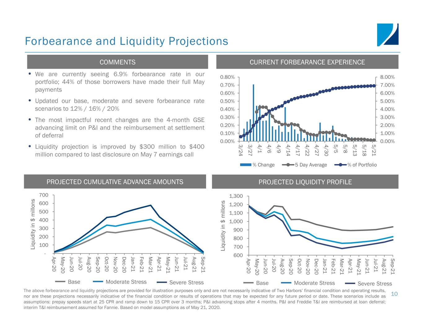 Forbearance and Liquidity Projections COMMENTS CURRENT FORBEARANCE EXPERIENCE • We are currently seeing 6.9% forbearance rate in our 0.80% 8.00% portfolio; 44% of those borrowers have made their full May 0.70% 7.00% payments 0.60% 6.00% • Updated our base, moderate and severe forbearance rate 0.50% 5.00% scenarios to 12% / 16% / 20% 0.40% 4.00% • The most impactful recent changes are the 4-month GSE 0.30% 3.00% advancing limit on P&I and the reimbursement at settlement 0.20% 2.00% of deferral 0.10% 1.00% 0.00% 0.00% 3/27 4/1 4/6 4/9 4/14 4/17 4/22 4/27 4/30 5/5 5/8 5/13 5/18 5/21 • Liquidity projection is improved by $300 million to $400 3/24 million compared to last disclosure on May 7 earnings call % Change 5 Day Average % of Portfolio PROJECTED CUMULATIVE ADVANCE AMOUNTS PROJECTED LIQUIDITY PROFILE 700 1,300 600 1,200 500 1,100 Loan Balance Loan Balance 400 1,000 58% 69% 300 900 200 800 100 700 Geography Liquidity Liquidity in $ millons Liquidity Liquidity in $ millons 16% - Geography May-20 Jun-20 Jul-20 Aug-20 Sep-20 Oct-20 Nov-20 Dec-20 Jan-21 Feb-21 Mar-21 Apr-21 May-21 Jun-21 Jul-21 Aug-21 Sep-21 Apr-20 600 LTV Apr-20 May-20 Jun-20 Jul-20 Aug-20 Sep-20 Oct-20 Nov-20 Dec-20 Jan-21 Feb-21 Mar-21 Apr-21 May-21 Jun-21 Jul-21 Aug-21 Sep-21 30% 23% Base Moderate Stress Severe Stress Base Moderate Stress Severe Stress The above forbearance and liquidity projections are provided for illustration purposes only and are not necessarily indicative of Two Harbors’ financial condition and operating results, nor are these projections necessarily indicative of the financial condition or results of operations that may be expected for any future period or date. These scenarios include as 10 assumptions: prepay speeds start at 25 CPR and ramp down to 15 CPR over 3 months; P&I advancing stops after 4 months. P&I and Freddie T&I are reimbursed at loan deferral; interim T&I reimbursement assumed for Fannie. Based on model assumptions as of May 21, 2020.