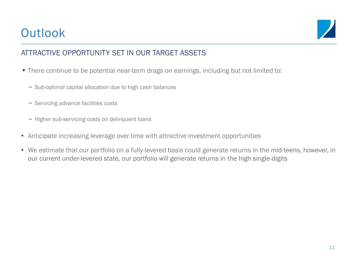 Outlook ATTRACTIVE OPPORTUNITY SET IN OUR TARGET ASSETS • There continue to be potential near-term drags on earnings, including but not limited to: – Sub-optimal capital allocation due to high cash balances – Servicing advance facilities costs – Higher sub-servicing costs on delinquent loans • Anticipate increasing leverage over time with attractive investment opportunities • We estimate that our portfolio on a fully-levered basis could generate returns in the mid-teens, however, in our current under-levered state, our portfolio will generate returns in the high single-digits 11
