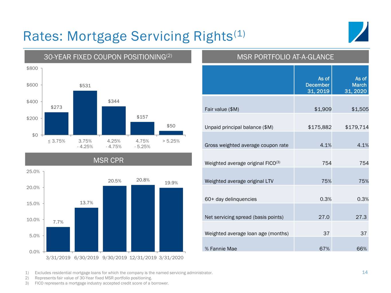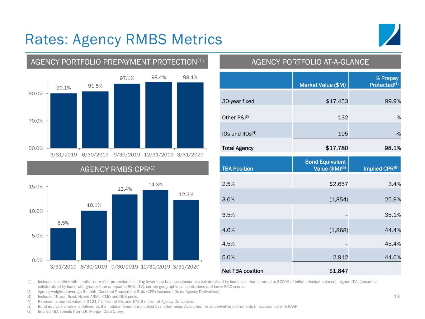 Rates: Agency RMBS Metrics AGENCY PORTFOLIO PREPAYMENT PROTECTION(1) AGENCY PORTFOLIO AT-A-GLANCE 97.1% 98.4% 98.1% % Prepay (1) 90.1% 91.5% Market Value ($M) Protected 90.0% 30-year fixed $17,453 99.9% Other P&I(3) 132 -% 70.0% IOs and IIOs(4) 195 -% 50.0% Total Agency $17,780 98.1% 3/31/2019 6/30/2019 9/30/2019 12/31/2019 3/31/2020 Bond Equivalent AGENCY RMBS CPR(2) TBA Position Value ($M)(5) Implied CPR(6) 14.3% 2.5% $2,657 3.4% 15.0% 13.4% 12.3% 3.0% (1,854) 25.9% 10.1% 10.0% 3.5% -- 35.1% 6.5% 4.0% (1,868) 44.4% 5.0% 4.5% -- 45.4% 5.0% 2,912 44.6% 0.0% 3/31/2019 6/30/2019 9/30/2019 12/31/2019 3/31/2020 Net TBA position $1,847 1) Includes securities with implicit or explicit protection including lower loan balances (securities collateralized by loans less than or equal to $200K of initial principal balance), higher LTVs (securities collateralized by loans with greater than or equal to 80% LTV), certain geographic concentrations and lower FICO scores. 2) Agency weighted average 3-month Constant Prepayment Rate (CPR) includes IIOs (or Agency Derivatives). 3) Includes 15-year fixed, Hybrid ARMs, CMO and DUS pools. 13 4) Represents market value of $121.7 million of IOs and $73.3 million of Agency Derivatives. 5) Bond equivalent value is defined as the notional amount multiplied by market price. Accounted for as derivative instruments in accordance with GAAP. 6) Implied TBA speeds from J.P. Morgan Data Query.