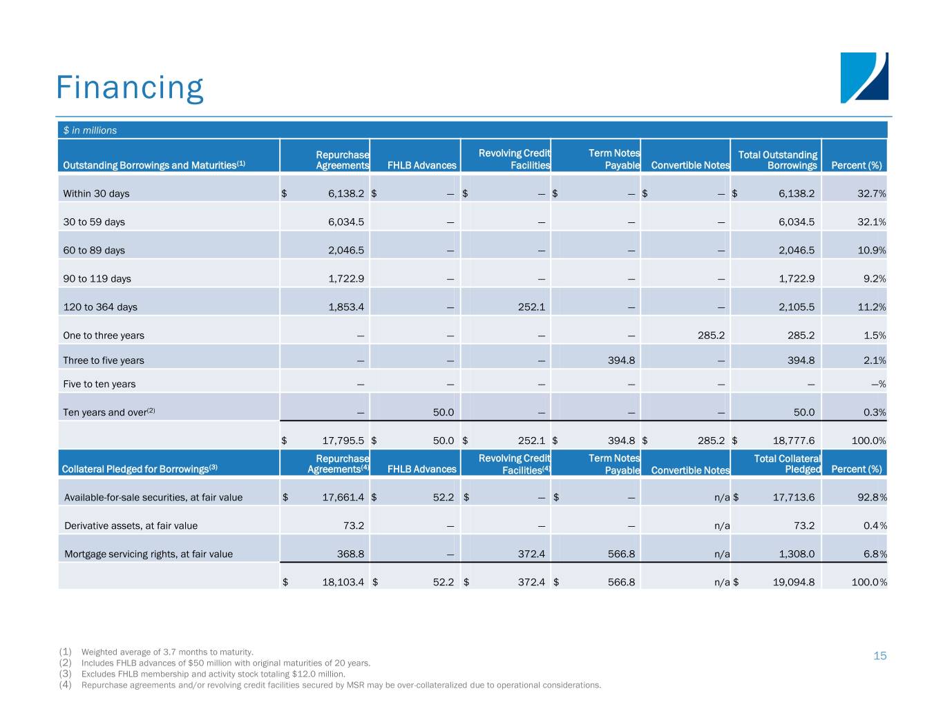 Financing $ in millions Repurchase Revolving Credit Term Notes Total Outstanding Outstanding Borrowings and Maturities(1) Agreements FHLB Advances Facilities Payable Convertible Notes Borrowings Percent (%) Within 30 days $ 6,138.2 $ — $ — $ — $ — $ 6,138.2 32.7% 30 to 59 days 6,034.5 — — — — 6,034.5 32.1% 60 to 89 days 2,046.5 — — — — 2,046.5 10.9% 90 to 119 days 1,722.9 — — — — 1,722.9 9.2% 120 to 364 days 1,853.4 — 252.1 — — 2,105.5 11.2% One to three years — — — — 285.2 285.2 1.5% Three to five years — — — 394.8 — 394.8 2.1% Five to ten years — — — — — — —% Ten years and over(2) — 50.0 — — — 50.0 0.3% $ 17,795.5 $ 50.0 $ 252.1 $ 394.8 $ 285.2 $ 18,777.6 100.0% Repurchase Revolving Credit Term Notes Total Collateral Collateral Pledged for Borrowings(3) Agreements(4) FHLB Advances Facilities(4) Payable Convertible Notes Pledged Percent (%) Available-for-sale securities, at fair value $ 17,661.4 $ 52.2 $ — $ — n/a $ 17,713.6 92.8% Derivative assets, at fair value 73.2 — — — n/a 73.2 0.4% Mortgage servicing rights, at fair value 368.8 — 372.4 566.8 n/a 1,308.0 6.8% $ 18,103.4 $ 52.2 $ 372.4 $ 566.8 n/a $ 19,094.8 100.0% (1) Weighted average of 3.7 months to maturity. 15 (2) Includes FHLB advances of $50 million with original maturities of 20 years. (3) Excludes FHLB membership and activity stock totaling $12.0 million. (4) Repurchase agreements and/or revolving credit facilities secured by MSR may be over-collateralized due to operational considerations.