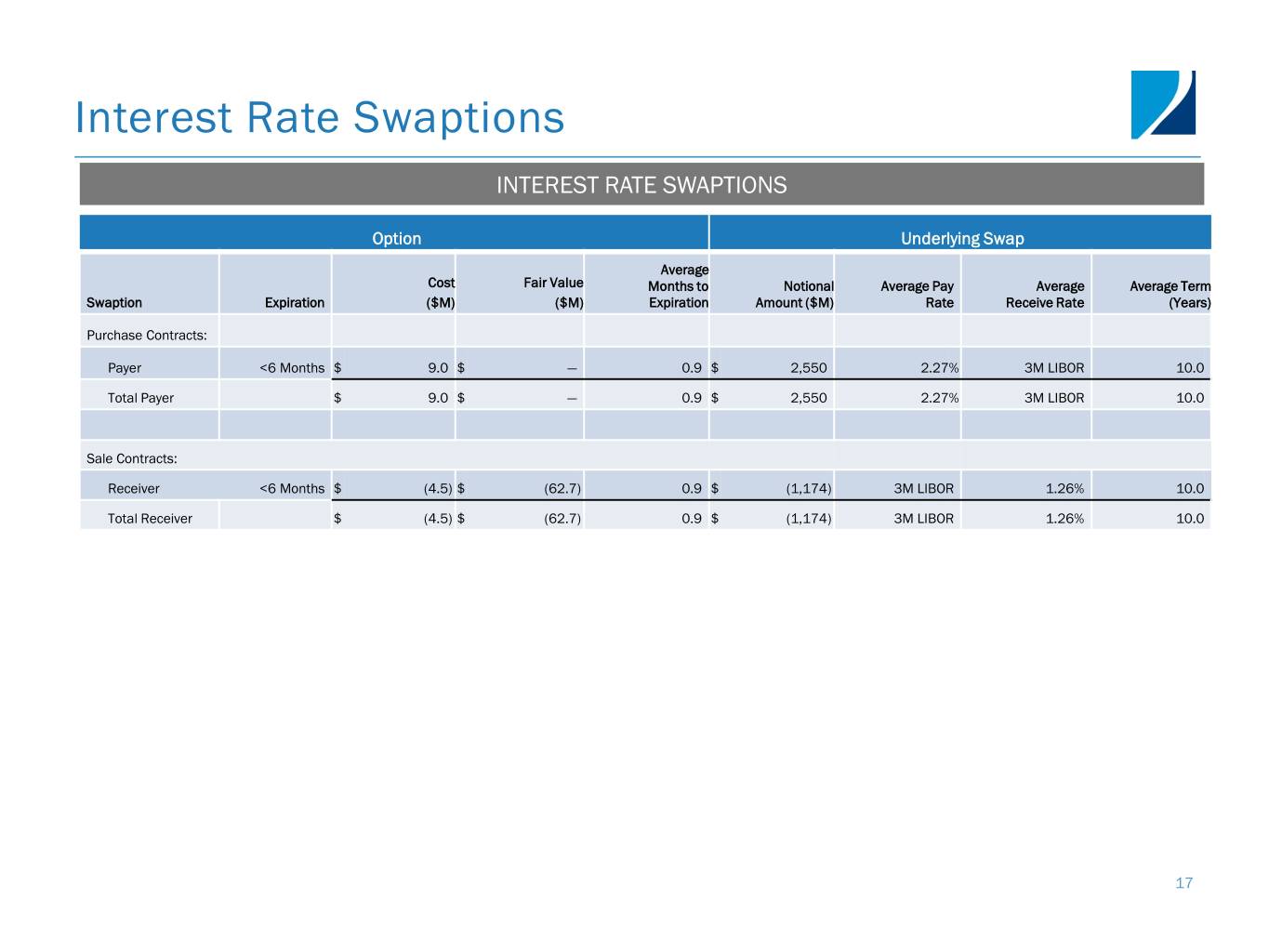 Interest Rate Swaptions INTEREST RATE SWAPTIONS Option Underlying Swap Average Cost Fair Value Months to Notional Average Pay Average Average Term Swaption Expiration ($M) ($M) Expiration Amount ($M) Rate Receive Rate (Years) Purchase Contracts: Payer <6 Months $ 9.0 $ — 0.9 $ 2,550 2.27% 3M LIBOR 10.0 Total Payer $ 9.0 $ — 0.9 $ 2,550 2.27% 3M LIBOR 10.0 Sale Contracts: Receiver <6 Months $ (4.5) $ (62.7) 0.9 $ (1,174) 3M LIBOR 1.26% 10.0 Total Receiver $ (4.5) $ (62.7) 0.9 $ (1,174) 3M LIBOR 1.26% 10.0 17