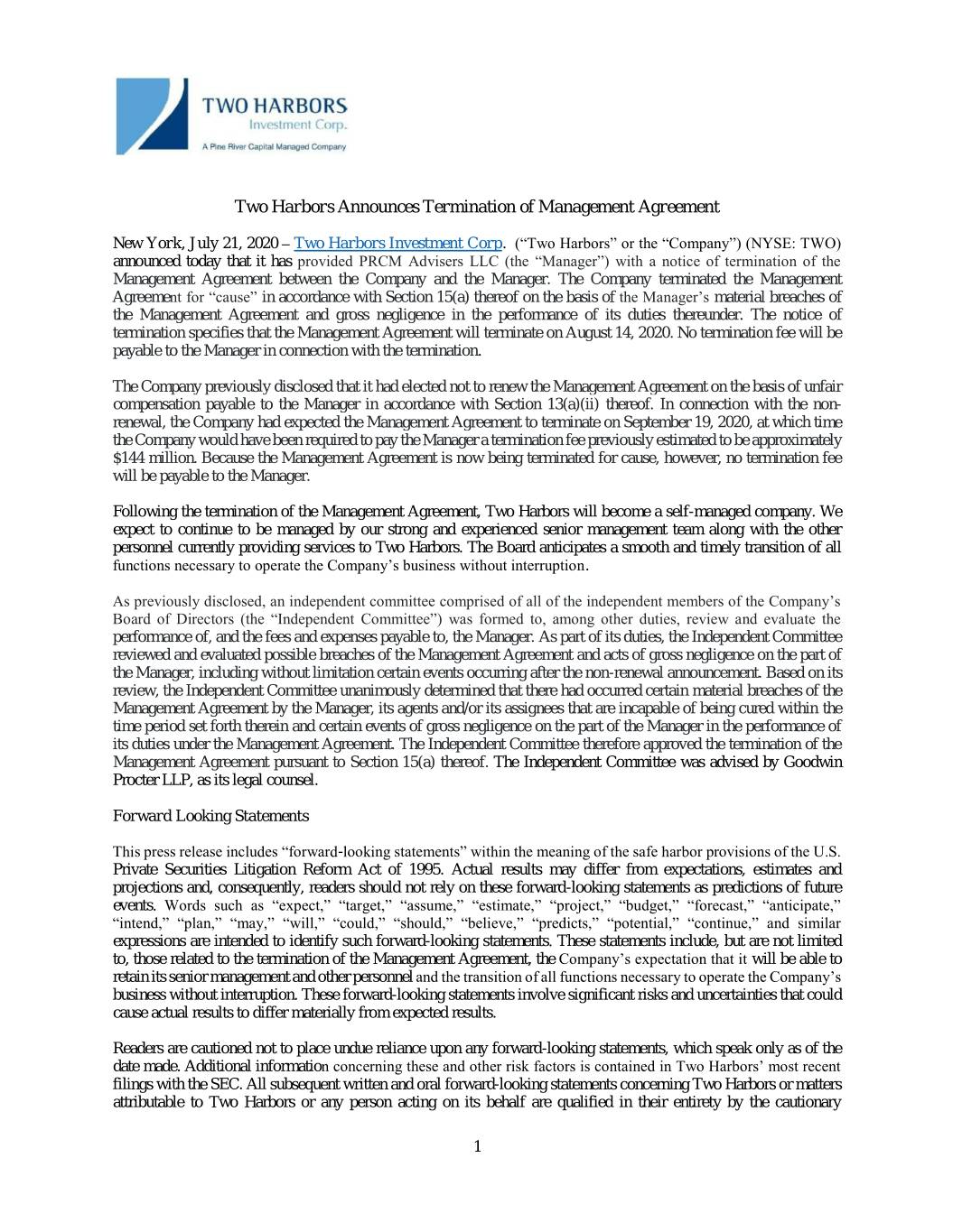 Two Harbors Announces Termination of Management Agreement New York, July 21, 2020 – Two Harbors Investment Corp. (“Two Harbors” or the “Company”) (NYSE: TWO) announced today that it has provided PRCM Advisers LLC (the “Manager”) with a notice of termination of the Management Agreement between the Company and the Manager. The Company terminated the Management Agreement for “cause” in accordance with Section 15(a) thereof on the basis of the Manager’s material breaches of the Management Agreement and gross negligence in the performance of its duties thereunder. The notice of termination specifies that the Management Agreement will terminate on August 14, 2020. No termination fee will be payable to the Manager in connection with the termination. The Company previously disclosed that it had elected not to renew the Management Agreement on the basis of unfair compensation payable to the Manager in accordance with Section 13(a)(ii) thereof. In connection with the non- renewal, the Company had expected the Management Agreement to terminate on September 19, 2020, at which time the Company would have been required to pay the Manager a termination fee previously estimated to be approximately $144 million. Because the Management Agreement is now being terminated for cause, however, no termination fee will be payable to the Manager. Following the termination of the Management Agreement, Two Harbors will become a self-managed company. We expect to continue to be managed by our strong and experienced senior management team along with the other personnel currently providing services to Two Harbors. The Board anticipates a smooth and timely transition of all functions necessary to operate the Company’s business without interruption. As previously disclosed, an independent committee comprised of all of the independent members of the Company’s Board of Directors (the “Independent Committee”) was formed to, among other duties, review and evaluate the performance of, and the fees and expenses payable to, the Manager. As part of its duties, the Independent Committee reviewed and evaluated possible breaches of the Management Agreement and acts of gross negligence on the part of the Manager, including without limitation certain events occurring after the non-renewal announcement. Based on its review, the Independent Committee unanimously determined that there had occurred certain material breaches of the Management Agreement by the Manager, its agents and/or its assignees that are incapable of being cured within the time period set forth therein and certain events of gross negligence on the part of the Manager in the performance of its duties under the Management Agreement. The Independent Committee therefore approved the termination of the Management Agreement pursuant to Section 15(a) thereof. The Independent Committee was advised by Goodwin Procter LLP, as its legal counsel. Forward Looking Statements This press release includes “forward-looking statements” within the meaning of the safe harbor provisions of the U.S. Private Securities Litigation Reform Act of 1995. Actual results may differ from expectations, estimates and projections and, consequently, readers should not rely on these forward-looking statements as predictions of future events. Words such as “expect,” “target,” “assume,” “estimate,” “project,” “budget,” “forecast,” “anticipate,” “intend,” “plan,” “may,” “will,” “could,” “should,” “believe,” “predicts,” “potential,” “continue,” and similar expressions are intended to identify such forward-looking statements. These statements include, but are not limited to, those related to the termination of the Management Agreement, the Company’s expectation that it will be able to retain its senior management and other personnel and the transition of all functions necessary to operate the Company’s business without interruption. These forward-looking statements involve significant risks and uncertainties that could cause actual results to differ materially from expected results. Readers are cautioned not to place undue reliance upon any forward-looking statements, which speak only as of the date made. Additional information concerning these and other risk factors is contained in Two Harbors’ most recent filings with the SEC. All subsequent written and oral forward-looking statements concerning Two Harbors or matters attributable to Two Harbors or any person acting on its behalf are qualified in their entirety by the cautionary 1