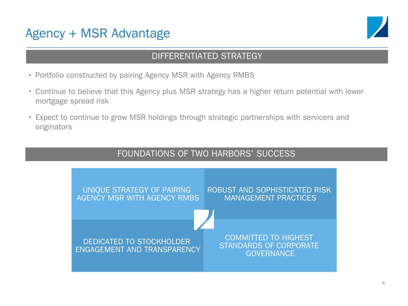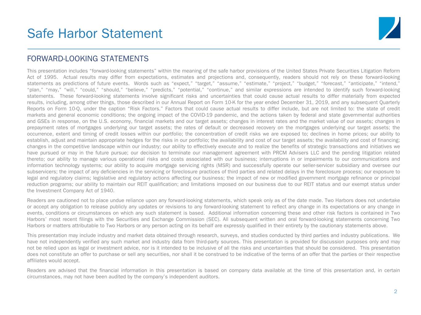 Safe Harbor Statement FORWARD-LOOKING STATEMENTS This presentation includes “forward-looking statements” within the meaning of the safe harbor provisions of the United States Private Securities Litigation Reform Act of 1995. Actual results may differ from expectations, estimates and projections and, consequently, readers should not rely on these forward-looking statements as predictions of future events. Words such as “expect,” “target,” “assume,” “estimate,” “project,” “budget,” “forecast,” “anticipate,” “intend,” “plan,” “may,” “will,” “could,” “should,” “believe,” “predicts,” “potential,” “continue,” and similar expressions are intended to identify such forward-looking statements. These forward-looking statements involve significant risks and uncertainties that could cause actual results to differ materially from expected results, including, among other things, those described in our Annual Report on Form 10-K for the year ended December 31, 2019, and any subsequent Quarterly Reports on Form 10-Q, under the caption “Risk Factors.” Factors that could cause actual results to differ include, but are not limited to: the state of credit markets and general economic conditions; the ongoing impact of the COVID-19 pandemic, and the actions taken by federal and state governmental authorities and GSEs in response, on the U.S. economy, financial markets and our target assets; changes in interest rates and the market value of our assets; changes in prepayment rates of mortgages underlying our target assets; the rates of default or decreased recovery on the mortgages underlying our target assets; the occurrence, extent and timing of credit losses within our portfolio; the concentration of credit risks we are exposed to; declines in home prices; our ability to establish, adjust and maintain appropriate hedges for the risks in our portfolio; the availability and cost of our target assets; the availability and cost of financing; changes in the competitive landscape within our industry; our ability to effectively execute and to realize the benefits of strategic transactions and initiatives we have pursued or may in the future pursue; our decision to terminate our management agreement with PRCM Advisers LLC and the pending litigation related thereto; our ability to manage various operational risks and costs associated with our business; interruptions in or impairments to our communications and information technology systems; our ability to acquire mortgage servicing rights (MSR) and successfully operate our seller-servicer subsidiary and oversee our subservicers; the impact of any deficiencies in the servicing or foreclosure practices of third parties and related delays in the foreclosure process; our exposure to legal and regulatory claims; legislative and regulatory actions affecting our business; the impact of new or modified government mortgage refinance or principal reduction programs; our ability to maintain our REIT qualification; and limitations imposed on our business due to our REIT status and our exempt status under the Investment Company Act of 1940. Readers are cautioned not to place undue reliance upon any forward-looking statements, which speak only as of the date made. Two Harbors does not undertake or accept any obligation to release publicly any updates or revisions to any forward-looking statement to reflect any change in its expectations or any change in events, conditions or circumstances on which any such statement is based. Additional information concerning these and other risk factors is contained in Two Harbors’ most recent filings with the Securities and Exchange Commission (SEC). All subsequent written and oral forward-looking statements concerning Two Harbors or matters attributable to Two Harbors or any person acting on its behalf are expressly qualified in their entirety by the cautionary statements above. This presentation may include industry and market data obtained through research, surveys, and studies conducted by third parties and industry publications. We have not independently verified any such market and industry data from third-party sources. This presentation is provided for discussion purposes only and may not be relied upon as legal or investment advice, nor is it intended to be inclusive of all the risks and uncertainties that should be considered. This presentation does not constitute an offer to purchase or sell any securities, nor shall it be construed to be indicative of the terms of an offer that the parties or their respective affiliates would accept. Readers are advised that the financial information in this presentation is based on company data available at the time of this presentation and, in certain circumstances, may not have been audited by the company’s independent auditors. 2