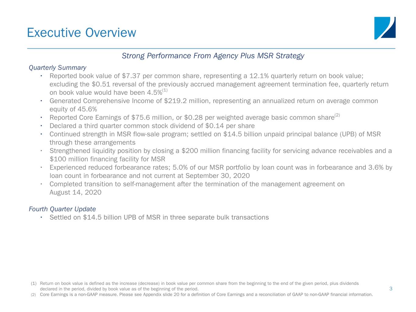Executive Overview Strong Performance From Agency Plus MSR Strategy Quarterly Summary • Reported book value of $7.37 per common share, representing a 12.1% quarterly return on book value; excluding the $0.51 reversal of the previously accrued management agreement termination fee, quarterly return on book value would have been 4.5%(1) • Generated Comprehensive Income of $219.2 million, representing an annualized return on average common equity of 45.6% • Reported Core Earnings of $75.6 million, or $0.28 per weighted average basic common share(2) • Declared a third quarter common stock dividend of $0.14 per share • Continued strength in MSR flow-sale program; settled on $14.5 billion unpaid principal balance (UPB) of MSR through these arrangements • Strengthened liquidity position by closing a $200 million financing facility for servicing advance receivables and a $100 million financing facility for MSR • Experienced reduced forbearance rates; 5.0% of our MSR portfolio by loan count was in forbearance and 3.6% by loan count in forbearance and not current at September 30, 2020 • Completed transition to self-management after the termination of the management agreement on August 14, 2020 Fourth Quarter Update • Settled on $14.5 billion UPB of MSR in three separate bulk transactions (1) Return on book value is defined as the increase (decrease) in book value per common share from the beginning to the end of the given period, plus dividends declared in the period, divided by book value as of the beginning of the period. 3 (2) Core Earnings is a non-GAAP measure. Please see Appendix slide 20 for a definition of Core Earnings and a reconciliation of GAAP to non-GAAP financial information.