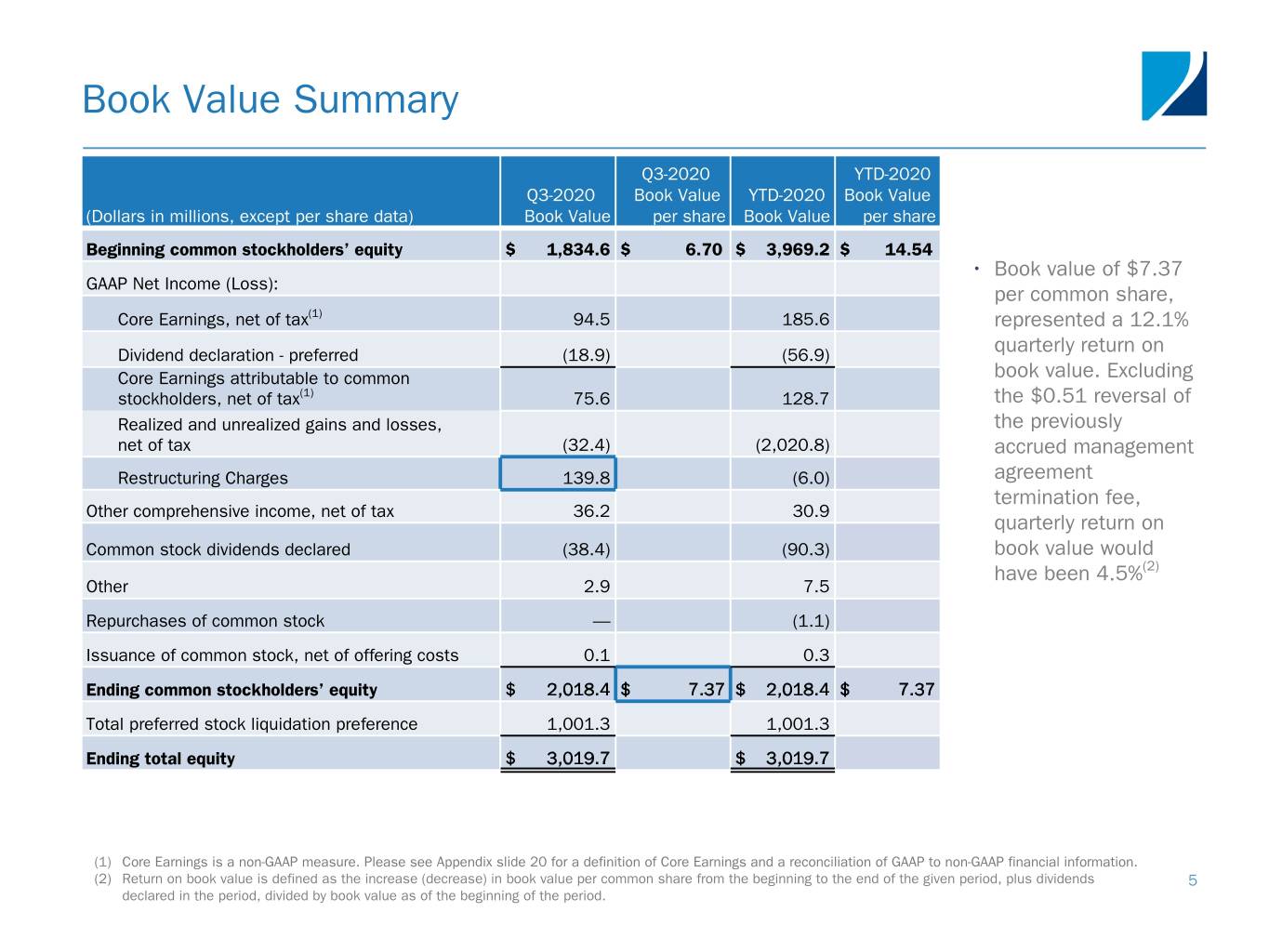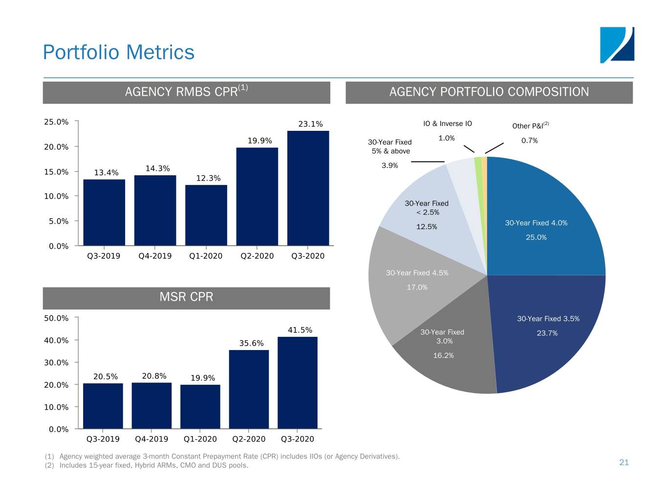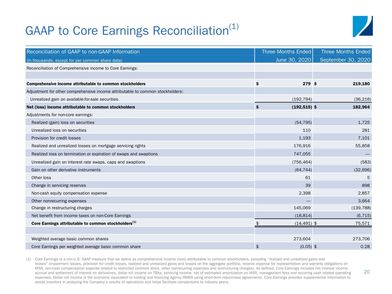 GAAP to Core Earnings Reconciliation(1) Reconciliation of GAAP to non-GAAP Information Three Months Ended Three Months Ended (In thousands, except for per common share data) June 30, 2020 September 30, 2020 Reconciliation of Comprehensive income to Core Earnings: Comprehensive income attributable to common stockholders $ 279 $ 219,180 Adjustment for other comprehensive income attributable to common stockholders: Unrealized gain on available-for-sale securities (192,794) (36,216) Net (loss) income attributable to common stockholders $ (192,515) $ 182,964 Adjustments for non-core earnings: Realized (gain) loss on securities (54,795) 1,725 Unrealized loss on securities 110 281 Provision for credit losses 1,193 7,101 Realized and unrealized losses on mortgage servicing rights 176,916 55,858 Realized loss on termination or expiration of swaps and swaptions 747,055 — Unrealized gain on interest rate swaps, caps and swaptions (756,464) (583) Gain on other derivative instruments (64,744) (32,696) Other loss 61 5 Change in servicing reserves 39 898 Non-cash equity compensation expense 2,398 2,857 Other nonrecurring expenses — 3,664 Change in restructuring charges 145,069 (139,788) Net benefit from income taxes on non-Core Earnings (18,814) (6,715) Core Earnings attributable to common stockholders(1) $ (14,491) $ 75,571 Weighted average basic common shares 273,604 273,706 Core Earnings per weighted average basic common share $ (0.05) $ 0.28 (1) Core Earnings is a non-U.S. GAAP measure that we define as comprehensive income (loss) attributable to common stockholders, excluding “realized and unrealized gains and losses” (impairment losses, provision for credit losses, realized and unrealized gains and losses on the aggregate portfolio, reserve expense for representation and warranty obligations on MSR, non-cash compensation expense related to restricted common stock, other nonrecurring expenses and restructuring charges). As defined, Core Earnings includes net interest income, accrual and settlement of interest on derivatives, dollar roll income on TBAs, servicing income, net of estimated amortization on MSR, management fees and recurring cash related operating 20 expenses. Dollar roll income is the economic equivalent to holding and financing Agency RMBS using short-term repurchase agreements. Core Earnings provides supplemental information to assist investors in analyzing the Company’s results of operations and helps facilitate comparisons to industry peers.