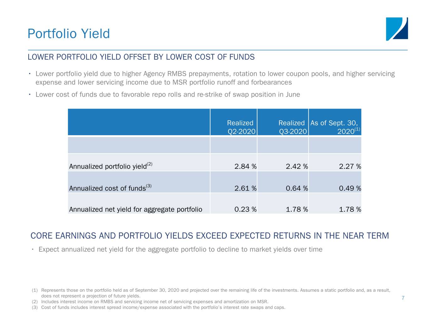 Core Earnings Review(1) ($ in millions, except per share data) Q2-2020 Q3-2020 Variance ($) • Third quarter Core Earnings results Interest income $ 107.3 $ 89.7 $ (17.6) impacted by: Interest expense 62.1 29.2 32.9 ◦ Net interest income increased from Net interest income 45.2 60.5 15.3 $45.2 million to $60.5 million due to Servicing income, net of amortization on favorable repo terms on lower LIBOR MSR 51.0 42.2 (8.8) offset by higher Agency RMBS Gain (loss) on swaps and swaptions (56.3) 0.8 57.1 prepayments and rotation to lower coupon pools Gain on other derivatives 11.9 32.9 21.0 ◦ Interest spread on swaps improved from Other 0.1 0.1 — -$56.3 million in Q2 to +$0.8 million in Q3 due to re-strike of swap position in Total other income 6.7 76.0 69.3 the second quarter to market rates Expenses 46.8 43.5 3.3 ◦ Expenses declined from $46.8 million to Provision for income taxes 0.6 (1.5) 2.1 $43.5 million primarily due to termination of the management Core Earnings(1) 4.5 94.5 90.0 agreement on August 14th and transition Dividends on preferred stock 19.0 18.9 0.1 to self-management Core Earnings attributable to common stockholders(1) $ (14.5) $ 75.6 $ 90.1 Basic weighted average Core EPS $ (0.05) $ 0.28 Core Earnings annualized return on average common equity (3.1) % 15.7 % (1) Core Earnings is a non-GAAP measure. Please see Appendix slide 20 for a definition of Core Earnings and a reconciliation of GAAP to non-GAAP financial information. 6