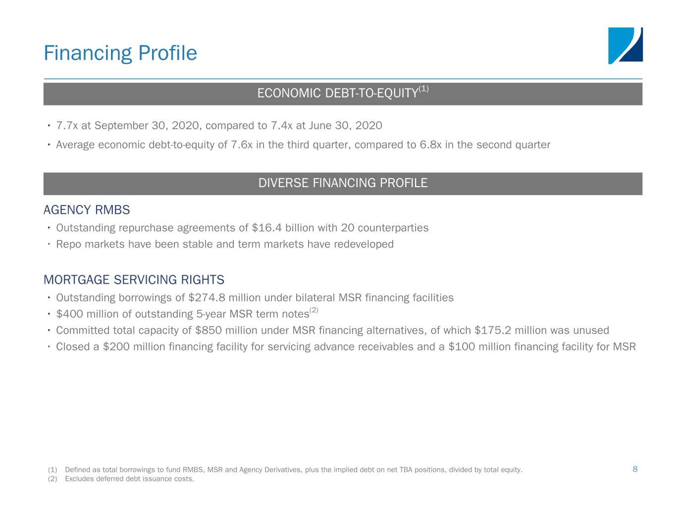 Portfolio Yield LOWER PORTFOLIO YIELD OFFSET BY LOWER COST OF FUNDS • Lower portfolio yield due to higher Agency RMBS prepayments, rotation to lower coupon pools, and higher servicing expense and lower servicing income due to MSR portfolio runoff and forbearances • Lower cost of funds due to favorable repo rolls and re-strike of swap position in June Realized Realized As of Sept. 30, Q2-2020 Q3-2020 2020(1) Annualized portfolio yield(2) 2.84 % 2.42 % 2.27 % Annualized cost of funds(3) 2.61 % 0.64 % 0.49 % Annualized net yield for aggregate portfolio 0.23 % 1.78 % 1.78 % CORE EARNINGS AND PORTFOLIO YIELDS EXCEED EXPECTED RETURNS IN THE NEAR TERM • Expect annualized net yield for the aggregate portfolio to decline to market yields over time (1) Represents those on the portfolio held as of September 30, 2020 and projected over the remaining life of the investments. Assumes a static portfolio and, as a result, does not represent a projection of future yields. 7 (2) Includes interest income on RMBS and servicing income net of servicing expenses and amortization on MSR. (3) Cost of funds includes interest spread income/expense associated with the portfolio’s interest rate swaps and caps.