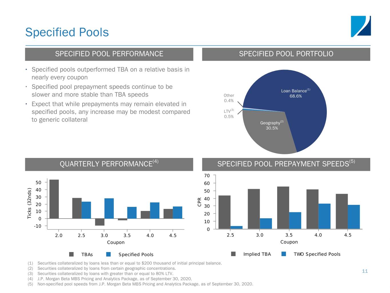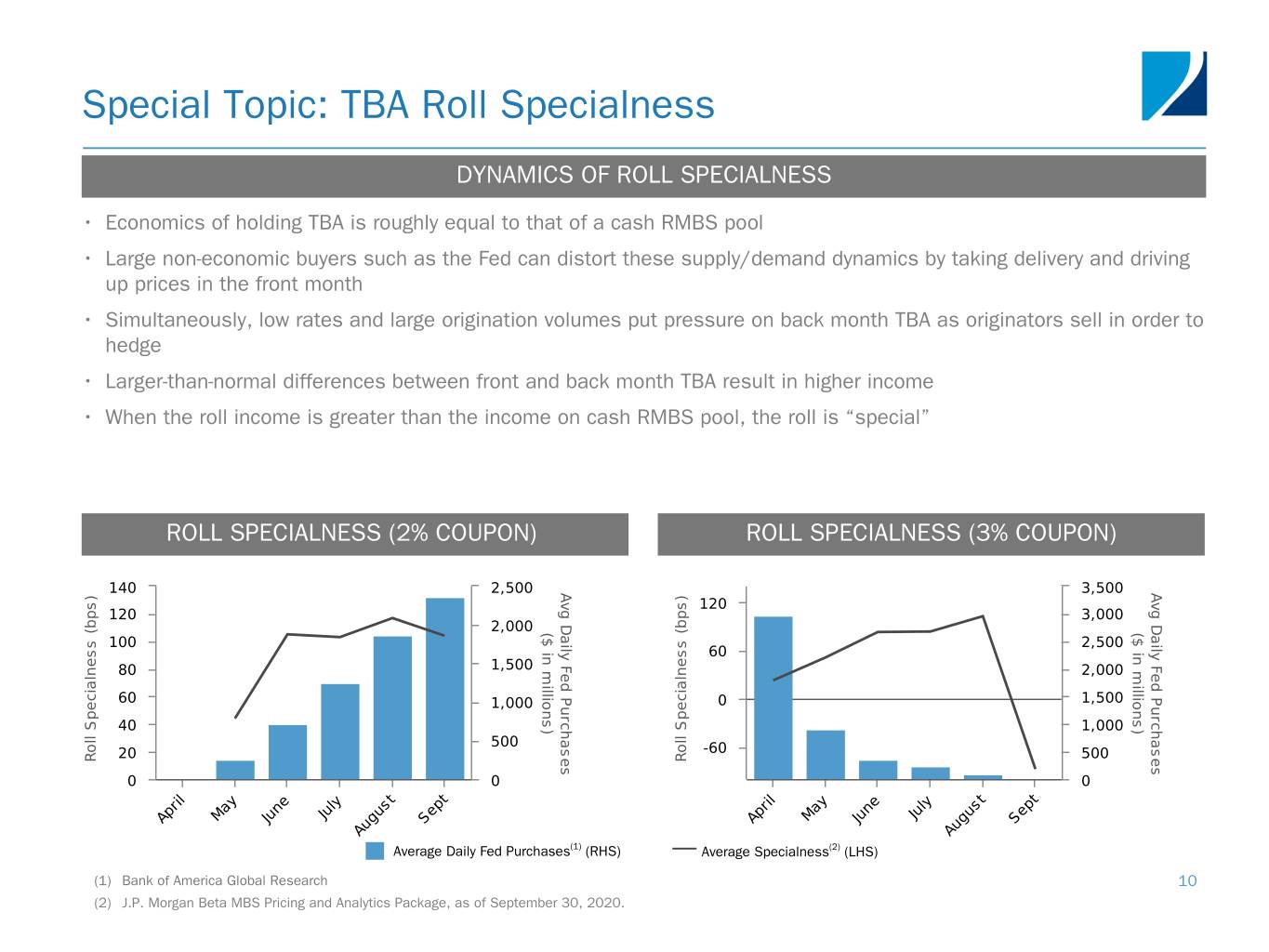 Special Topic: TBA Roll Specialness DYNAMICS OF ROLL SPECIALNESS • Economics of holding TBA is roughly equal to that of a cash RMBS pool • Large non-economic buyers such as the Fed can distort these supply/demand dynamics by taking delivery and driving up prices in the front month • Simultaneously, low rates and large origination volumes put pressure on back month TBA as originators sell in order to hedge • Larger-than-normal differences between front and back month TBA result in higher income • When the roll income is greater than the income on cash RMBS pool, the roll is “special” ROLL SPECIALNESS (2% COUPON) ROLL SPECIALNESS (3% COUPON) Average Daily Fed Purchases(1) (RHS) Average Specialness(2) (LHS) (1) Bank of America Global Research 10 (2) J.P. Morgan Beta MBS Pricing and Analytics Package, as of September 30, 2020.