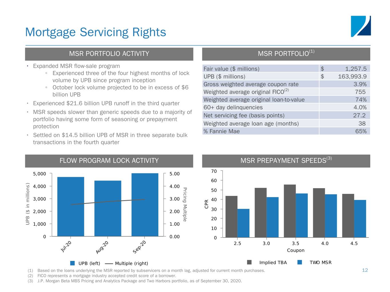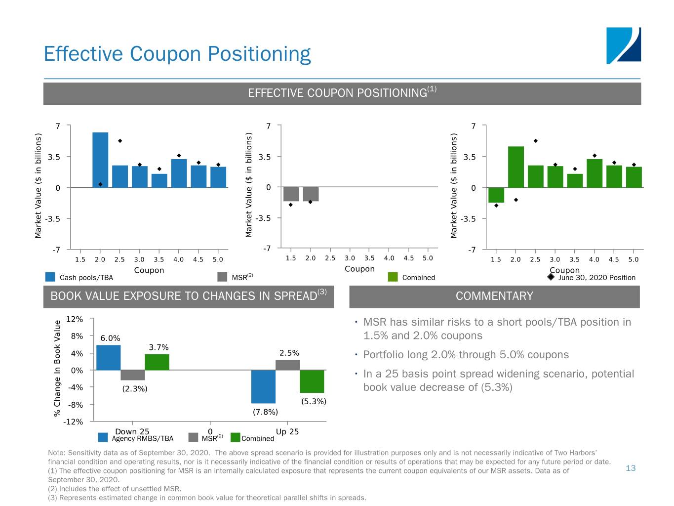 Mortgage Servicing Rights MSR PORTFOLIO ACTIVITY MSR PORTFOLIO(1) • Expanded MSR flow-sale program Fair value ($ millions) $ 1,257.5 Experienced three of the four highest months of lock ◦ UPB ($ millions) $ 163,993.9 volume by UPB since program inception Gross weighted average coupon rate 3.9 % ◦ October lock volume projected to be in excess of $6 (2) billion UPB Weighted average original FICO 755 Weighted average original loan-to-value 74 % • Experienced $21.6 billion UPB runoff in the third quarter 60+ day delinquencies 4.0 % • MSR speeds slower than generic speeds due to a majority of Net servicing fee (basis points) 27.2 portfolio having some form of seasoning or prepayment protection Weighted average loan age (months) 38 % Fannie Mae 65 % • Settled on $14.5 billion UPB of MSR in three separate bulk transactions in the fourth quarter FLOW PROGRAM LOCK ACTIVITY MSR PREPAYMENT SPEEDS(3) (1) Based on the loans underlying the MSR reported by subservicers on a month lag, adjusted for current month purchases. 12 (2) FICO represents a mortgage industry accepted credit score of a borrower. (3) J.P. Morgan Beta MBS Pricing and Analytics Package and Two Harbors portfolio, as of September 30, 2020.