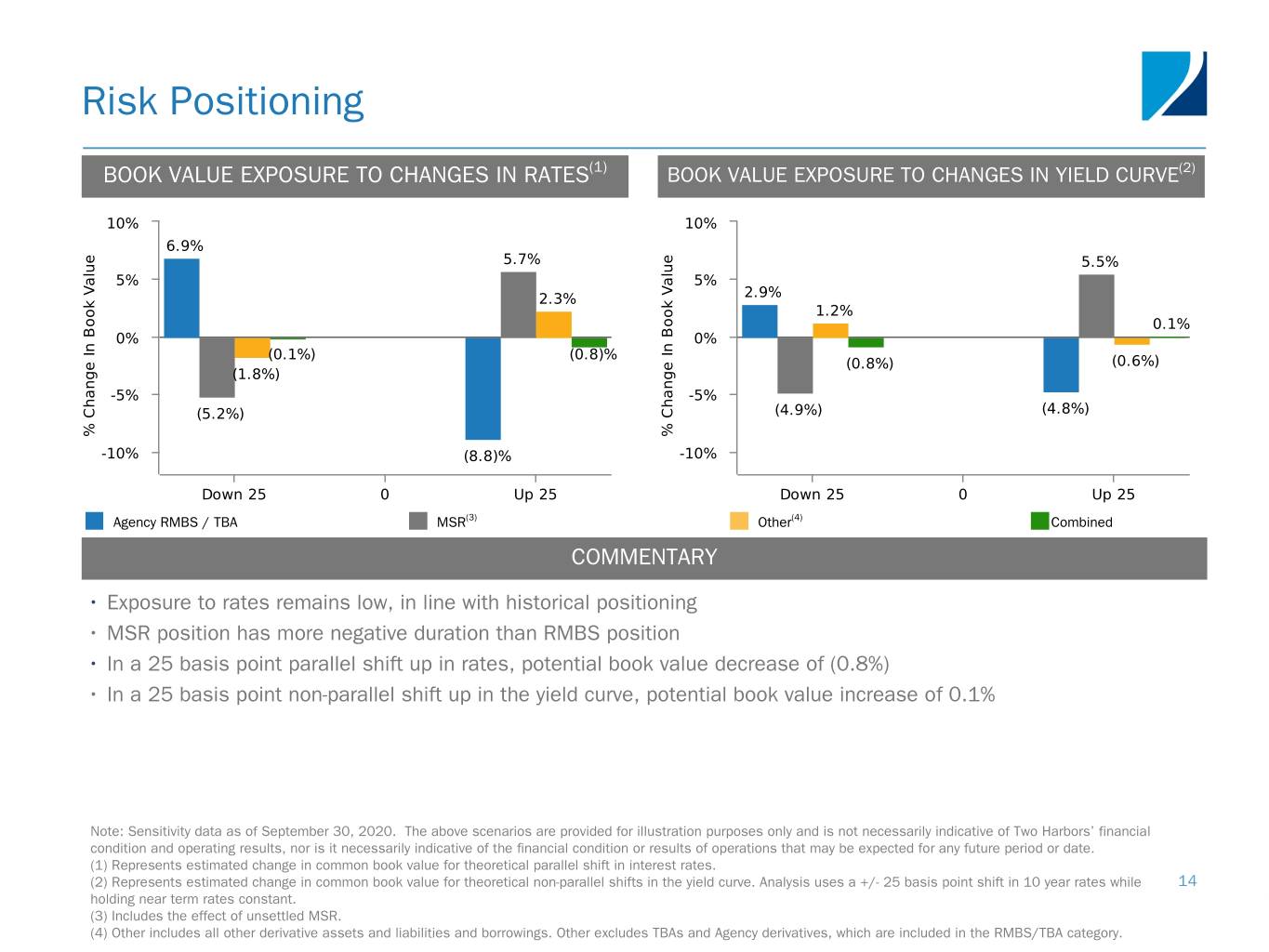 Effective Coupon Positioning EFFECTIVE COUPON POSITIONING(1) Cash pools/TBA MSR(2) Combined June 30, 2020 Position BOOK VALUE EXPOSURE TO CHANGES IN SPREAD(3) COMMENTARY • MSR has similar risks to a short pools/TBA position in 1.5% and 2.0% coupons • Portfolio long 2.0% through 5.0% coupons • In a 25 basis point spread widening scenario, potential book value decrease of (5.3%) Agency RMBS/TBA MSR(2) Combined Note: Sensitivity data as of September 30, 2020. The above spread scenario is provided for illustration purposes only and is not necessarily indicative of Two Harbors’ financial condition and operating results, nor is it necessarily indicative of the financial condition or results of operations that may be expected for any future period or date. (1) The effective coupon positioning for MSR is an internally calculated exposure that represents the current coupon equivalents of our MSR assets. Data as of 13 September 30, 2020. (2) Includes the effect of unsettled MSR. (3) Represents estimated change in common book value for theoretical parallel shifts in spreads.