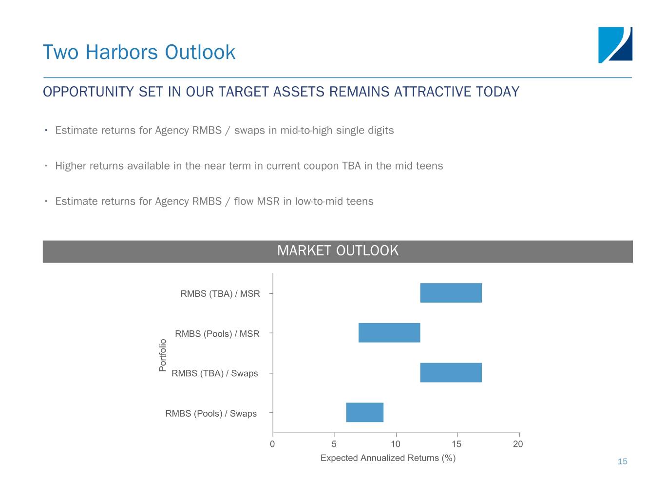 Two Harbors Outlook OPPORTUNITY SET IN OUR TARGET ASSETS REMAINS ATTRACTIVE TODAY • Estimate returns for Agency RMBS / swaps in mid-to-high single digits • Higher returns available in the near term in current coupon TBA in the mid teens • Estimate returns for Agency RMBS / flow MSR in low-to-mid teens MARKET OUTLOOK RMBS (TBA) / MSR RMBS (Pools) / MSR Po rtfolio RMBS (TBA) / Swaps RMBS (Pools) / Swaps 0 5 10 15 20 Expected Annualized Returns (%) 15