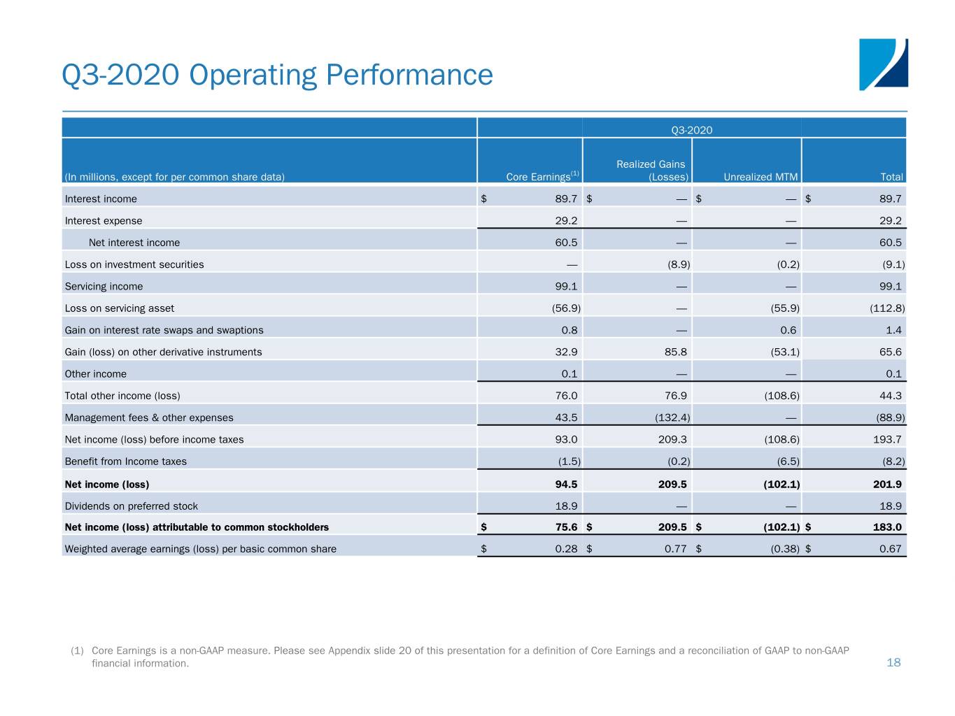 Q3-2020 Operating Performance Q3-2020 Realized Gains (In millions, except for per common share data) Core Earnings(1) (Losses) Unrealized MTM Total Interest income $ 89.7 $ — $ — $ 89.7 Interest expense 29.2 — — 29.2 Net interest income 60.5 — — 60.5 Loss on investment securities — (8.9) (0.2) (9.1) Servicing income 99.1 — — 99.1 Loss on servicing asset (56.9) — (55.9) (112.8) Gain on interest rate swaps and swaptions 0.8 — 0.6 1.4 Gain (loss) on other derivative instruments 32.9 85.8 (53.1) 65.6 Other income 0.1 — — 0.1 Total other income (loss) 76.0 76.9 (108.6) 44.3 Management fees & other expenses 43.5 (132.4) — (88.9) Net income (loss) before income taxes 93.0 209.3 (108.6) 193.7 Benefit from Income taxes (1.5) (0.2) (6.5) (8.2) Net income (loss) 94.5 209.5 (102.1) 201.9 Dividends on preferred stock 18.9 — — 18.9 Net income (loss) attributable to common stockholders $ 75.6 $ 209.5 $ (102.1) $ 183.0 Weighted average earnings (loss) per basic common share $ 0.28 $ 0.77 $ (0.38) $ 0.67 (1) Core Earnings is a non-GAAP measure. Please see Appendix slide 20 of this presentation for a definition of Core Earnings and a reconciliation of GAAP to non-GAAP financial information. 18