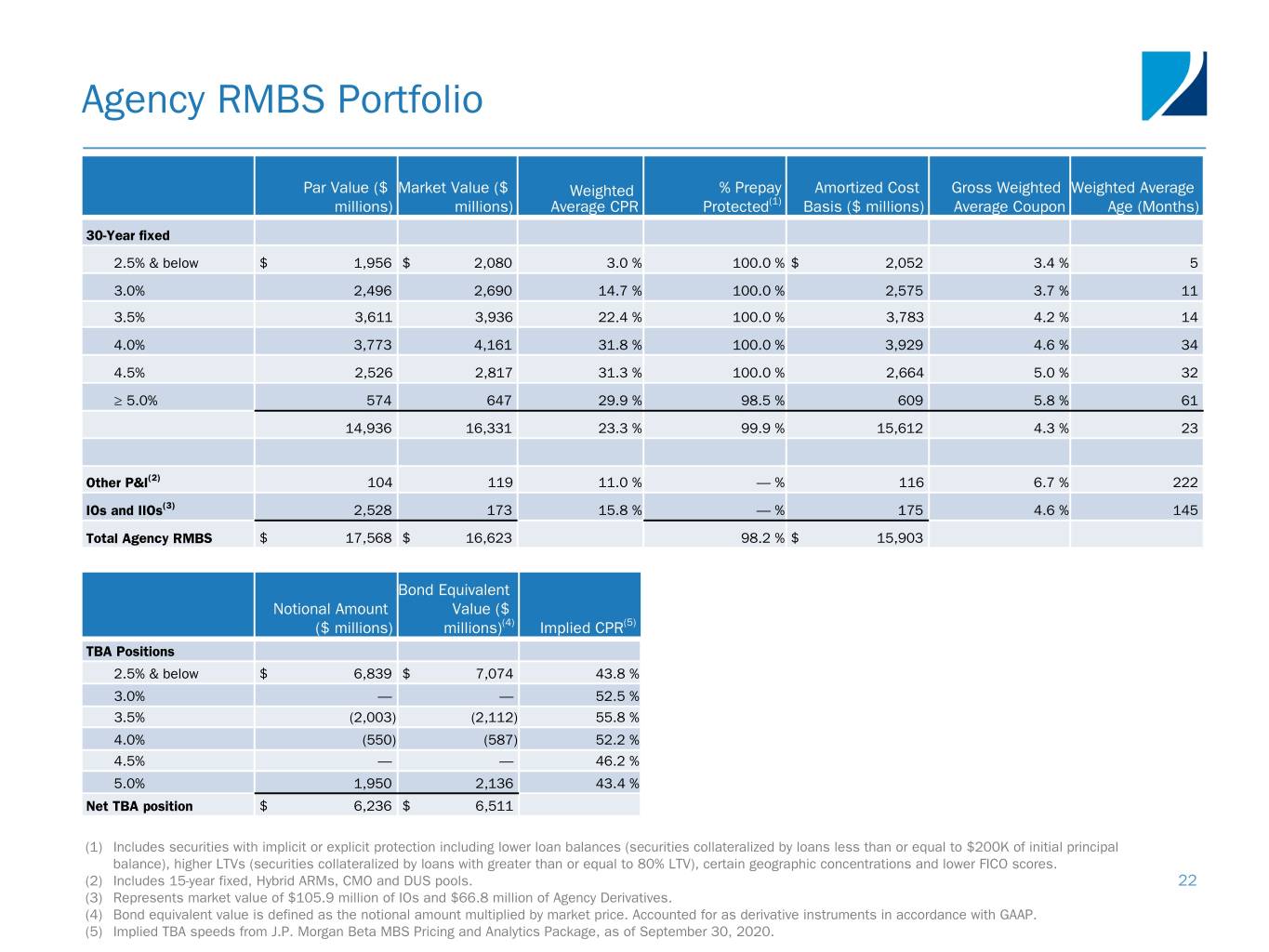 Agency RMBS Portfolio Par Value ($ Market Value ($ Weighted % Prepay Amortized Cost Gross Weighted Weighted Average millions) millions) Average CPR Protected(1) Basis ($ millions) Average Coupon Age (Months) 30-Year fixed 2.5% & below $ 1,956 $ 2,080 3.0 % 100.0 % $ 2,052 3.4 % 5 3.0% 2,496 2,690 14.7 % 100.0 % 2,575 3.7 % 11 3.5% 3,611 3,936 22.4 % 100.0 % 3,783 4.2 % 14 4.0% 3,773 4,161 31.8 % 100.0 % 3,929 4.6 % 34 4.5% 2,526 2,817 31.3 % 100.0 % 2,664 5.0 % 32 ≥ 5.0% 574 647 29.9 % 98.5 % 609 5.8 % 61 14,936 16,331 23.3 % 99.9 % 15,612 4.3 % 23 Other P&I(2) 104 119 11.0 % — % 116 6.7 % 222 IOs and IIOs(3) 2,528 173 15.8 % — % 175 4.6 % 145 Total Agency RMBS $ 17,568 $ 16,623 98.2 % $ 15,903 Bond Equivalent Notional Amount Value ($ ($ millions) millions)(4) Implied CPR(5) TBA Positions 2.5% & below $ 6,839 $ 7,074 43.8 % 3.0% — — 52.5 % 3.5% (2,003) (2,112) 55.8 % 4.0% (550) (587) 52.2 % 4.5% — — 46.2 % 5.0% 1,950 2,136 43.4 % Net TBA position $ 6,236 $ 6,511 (1) Includes securities with implicit or explicit protection including lower loan balances (securities collateralized by loans less than or equal to $200K of initial principal balance), higher LTVs (securities collateralized by loans with greater than or equal to 80% LTV), certain geographic concentrations and lower FICO scores. (2) Includes 15-year fixed, Hybrid ARMs, CMO and DUS pools. 22 (3) Represents market value of $105.9 million of IOs and $66.8 million of Agency Derivatives. (4) Bond equivalent value is defined as the notional amount multiplied by market price. Accounted for as derivative instruments in accordance with GAAP. (5) Implied TBA speeds from J.P. Morgan Beta MBS Pricing and Analytics Package, as of September 30, 2020.