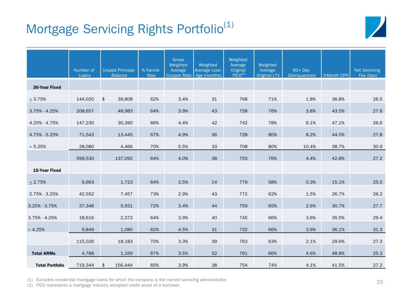 Mortgage Servicing Rights Portfolio(1) Gross Weighted Weighted Weighted Average Weighted Number of Unpaid Principal % Fannie Average Average Loan Original Average 60+ Day Net Servicing Loans Balance Mae Coupon Rate Age (months) FICO(2) Original LTV Delinquencies 3-Month CPR Fee (bps) 30-Year Fixed < 3.75% 144,020 $ 39,808 62% 3.4% 31 768 71% 1.8% 36.8% 26.5 3.75% - 4.25% 208,657 48,983 64 % 3.9 % 43 758 76 % 3.8 % 43.5 % 27.6 4.25% - 4.75% 147,230 30,390 66 % 4.4 % 42 742 78 % 6.1 % 47.1 % 26.6 4.75% - 5.25% 71,543 13,445 67 % 4.9 % 36 728 80 % 8.2 % 44.5 % 27.8 > 5.25% 28,080 4,466 70 % 5.5 % 33 708 80 % 10.4 % 38.7 % 30.9 599,530 137,092 64 % 4.0 % 38 753 76 % 4.4 % 42.8 % 27.2 15-Year Fixed < 2.75% 6,663 1,723 64 % 2.5 % 14 779 58 % 0.3 % 15.1 % 25.5 2.75% - 3.25% 42,552 7,457 73 % 2.9 % 43 772 62 % 1.5 % 26.7 % 26.2 3.25% - 3.75% 37,346 5,551 72 % 3.4 % 44 759 65 % 2.6 % 30.7 % 27.7 3.75% - 4.25% 18,616 2,372 64 % 3.9 % 40 745 66 % 3.6 % 35.5 % 29.4 > 4.25% 9,849 1,080 62 % 4.5 % 31 732 66 % 3.6 % 36.1 % 31.3 115,026 18,183 70 % 3.3 % 39 763 63 % 2.1 % 29.6 % 27.3 Total ARMs 4,788 1,169 67 % 3.5 % 52 761 66 % 4.6 % 48.8 % 25.3 Total Portfolio 719,344 $ 156,444 65 % 3.9 % 38 754 74 % 4.1 % 41.5 % 27.2 (1) Excludes residential mortgage loans for which the company is the named servicing administrator. 23 (2) FICO represents a mortgage industry accepted credit score of a borrower.