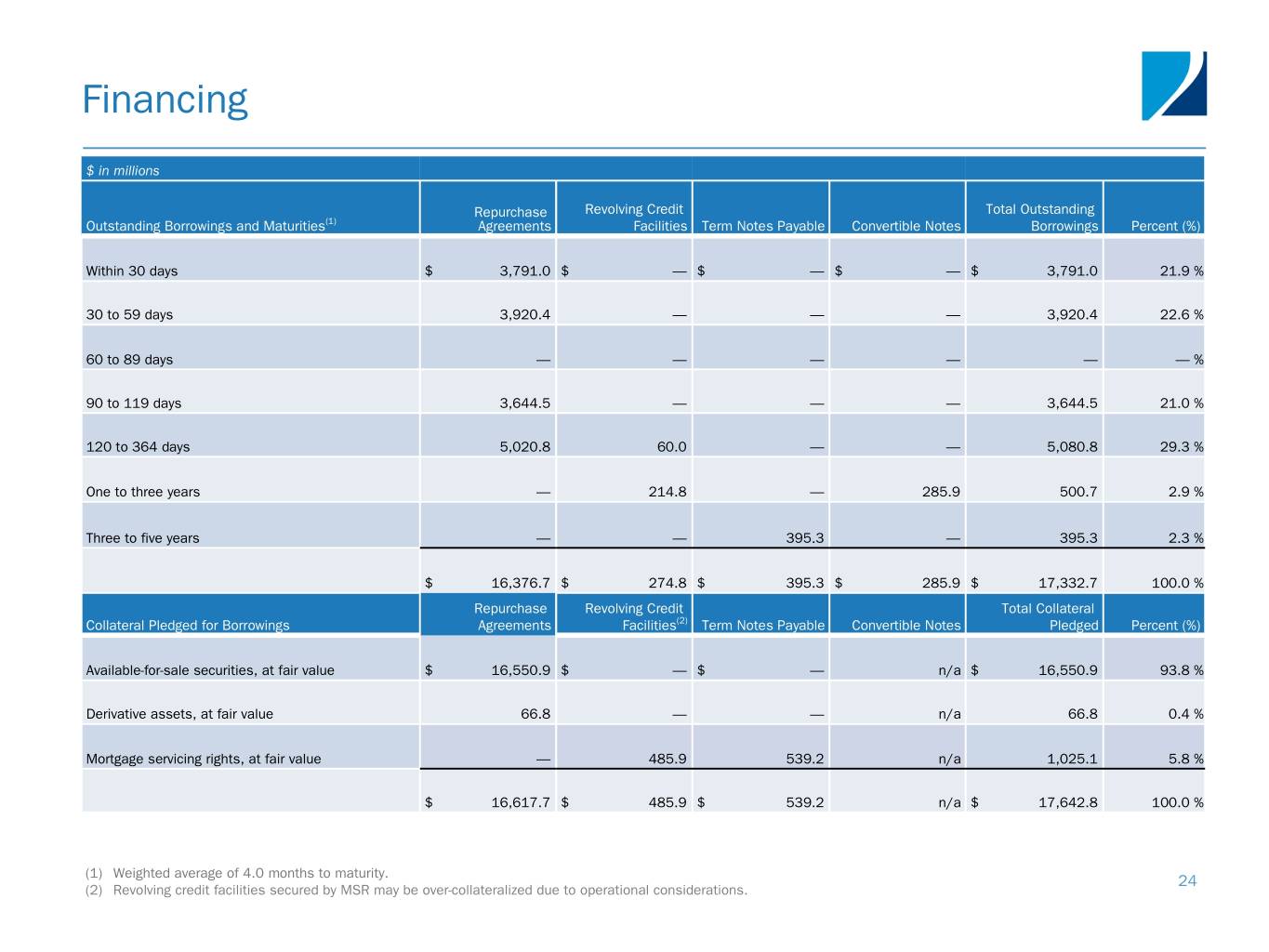 Financing $ in millions Repurchase Revolving Credit Total Outstanding Outstanding Borrowings and Maturities(1) Agreements Facilities Term Notes Payable Convertible Notes Borrowings Percent (%) Within 30 days $ 3,791.0 $ — $ — $ — $ 3,791.0 21.9 % 30 to 59 days 3,920.4 — — — 3,920.4 22.6 % 60 to 89 days — — — — — — % 90 to 119 days 3,644.5 — — — 3,644.5 21.0 % 120 to 364 days 5,020.8 60.0 — — 5,080.8 29.3 % One to three years — 214.8 — 285.9 500.7 2.9 % Three to five years — — 395.3 — 395.3 2.3 % $ 16,376.7 $ 274.8 $ 395.3 $ 285.9 $ 17,332.7 100.0 % Repurchase Revolving Credit Total Collateral Collateral Pledged for Borrowings Agreements Facilities(2) Term Notes Payable Convertible Notes Pledged Percent (%) Available-for-sale securities, at fair value $ 16,550.9 $ — $ — n/a $ 16,550.9 93.8 % Derivative assets, at fair value 66.8 — — n/a 66.8 0.4 % Mortgage servicing rights, at fair value — 485.9 539.2 n/a 1,025.1 5.8 % $ 16,617.7 $ 485.9 $ 539.2 n/a $ 17,642.8 100.0 % (1) Weighted average of 4.0 months to maturity. 24 (2) Revolving credit facilities secured by MSR may be over-collateralized due to operational considerations.