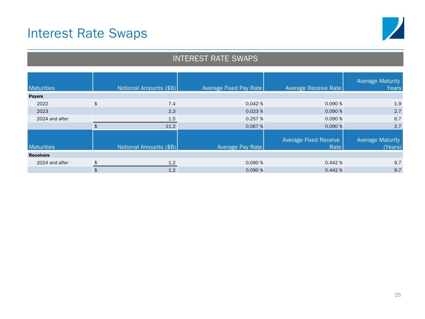 Interest Rate Swaps INTEREST RATE SWAPS Average Maturity Maturities Notional Amounts ($B) Average Fixed Pay Rate Average Receive Rate Years Payers 2022 $ 7.4 0.042 % 0.090 % 1.9 2023 2.3 0.023 % 0.090 % 2.7 2024 and after 1.5 0.257 % 0.090 % 6.7 $ 11.2 0.067 % 0.090 % 2.7 Average Fixed Receive Average Maturity Maturities Notional Amounts ($B) Average Pay Rate Rate (Years) Receivers 2024 and after $ 1.2 0.090 % 0.442 % 9.7 $ 1.2 0.090 % 0.442 % 9.7 25
