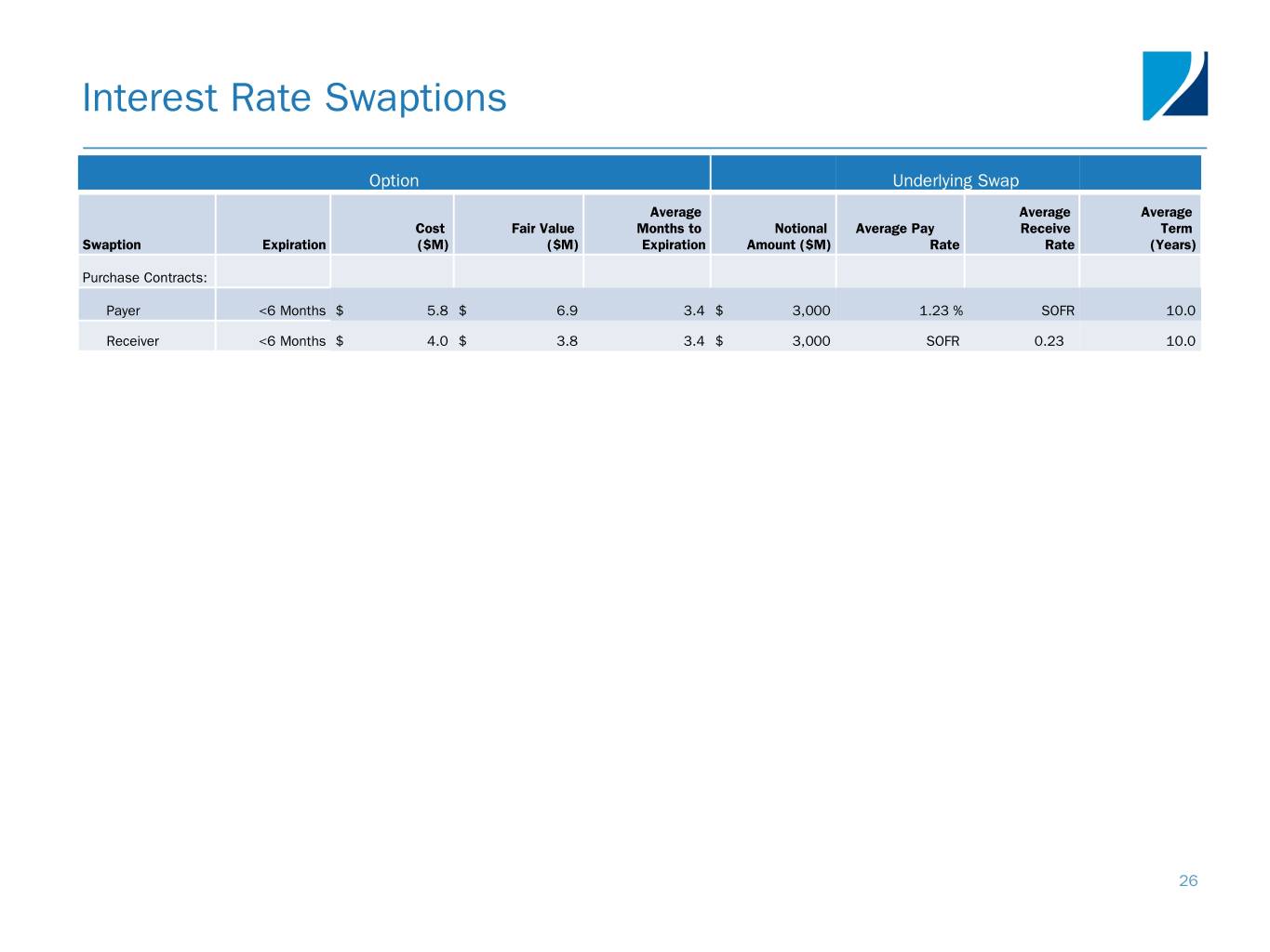 Interest Rate Swaptions Option Underlying Swap Average Average Average Cost Fair Value Months to Notional Average Pay Receive Term Swaption Expiration ($M) ($M) Expiration Amount ($M) Rate Rate (Years) Purchase Contracts: Payer <6 Months $ 5.8 $ 6.9 3.4 $ 3,000 1.23 % SOFR 10.0 Receiver <6 Months $ 4.0 $ 3.8 3.4 $ 3,000 SOFR 0.23 10.0 26
