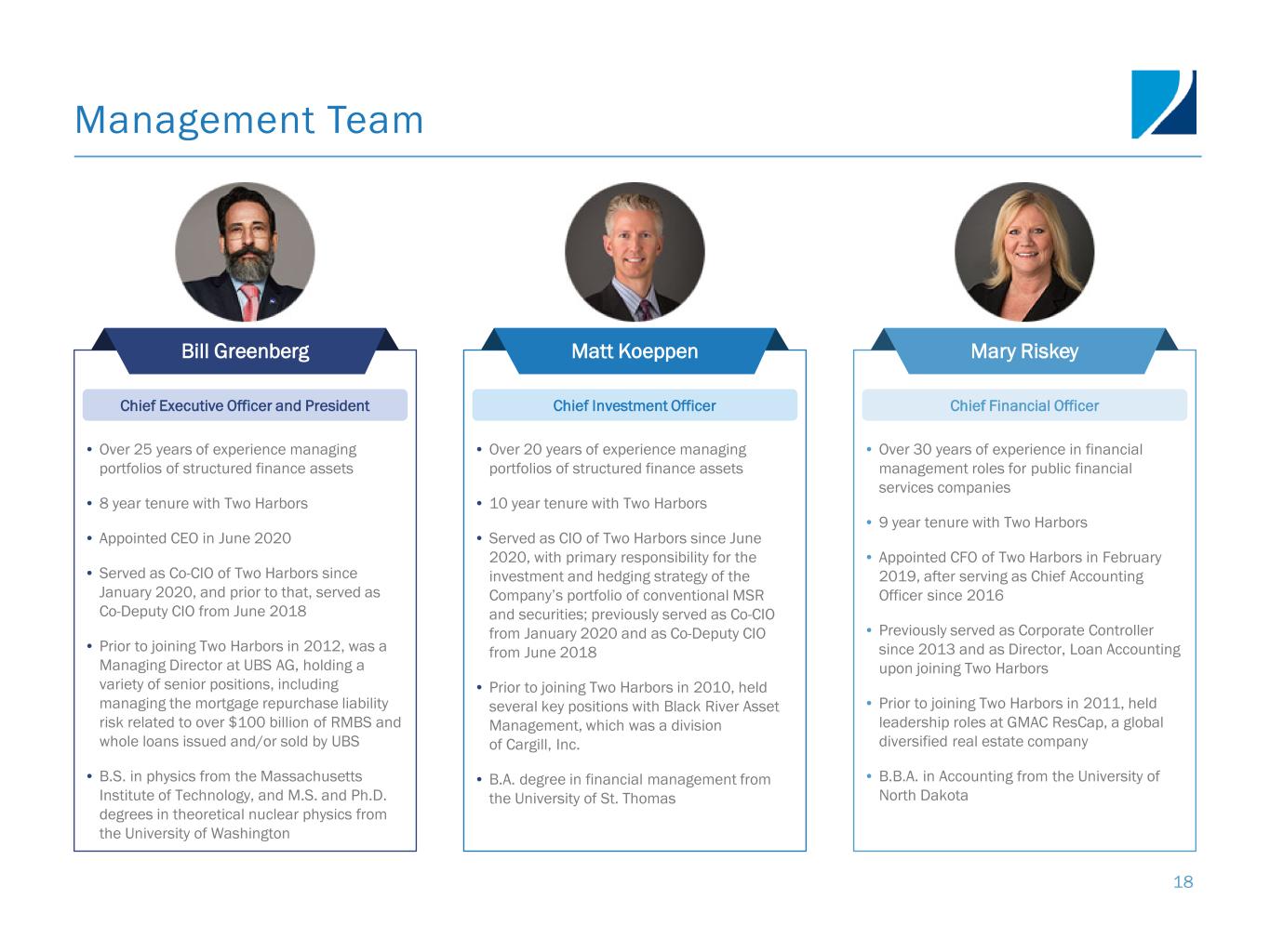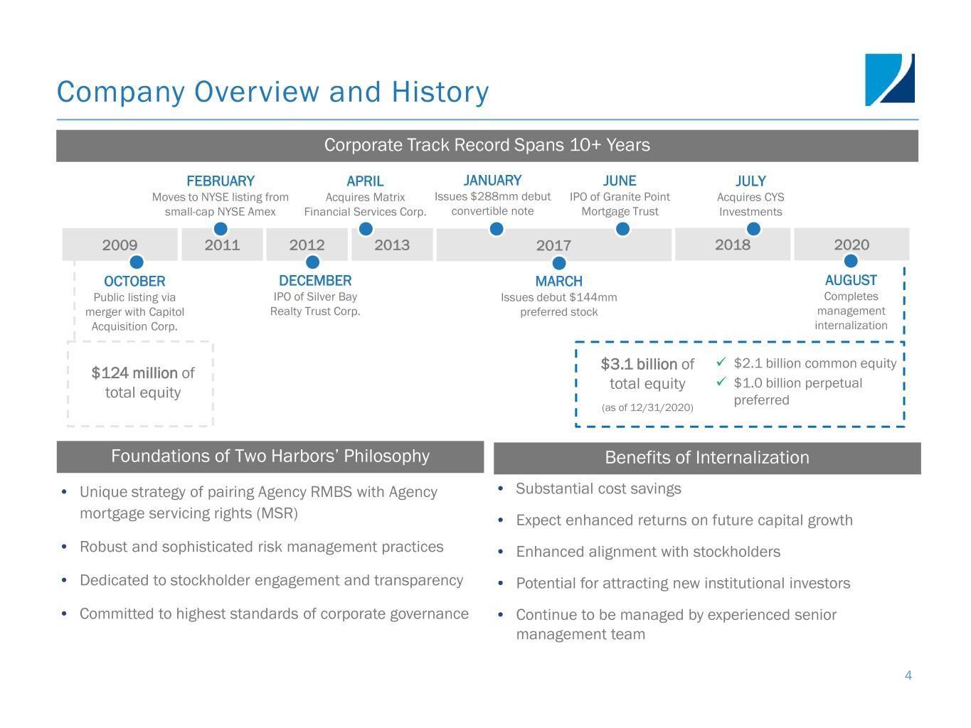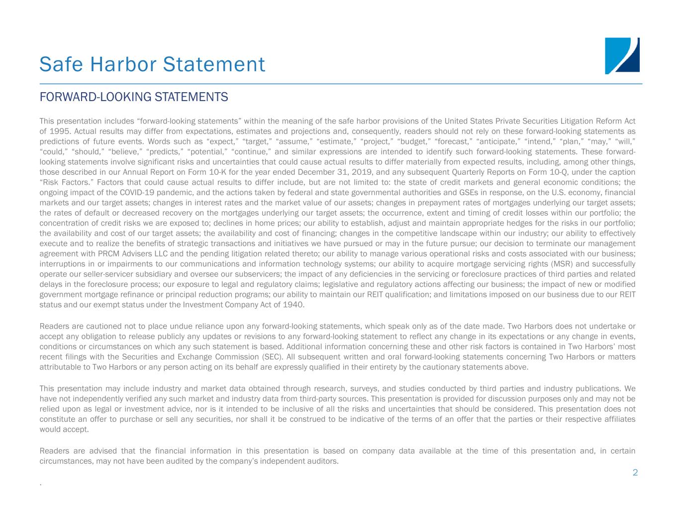 Safe Harbor Statement 2 FORWARD-LOOKING STATEMENTS This presentation includes “forward-looking statements” within the meaning of the safe harbor provisions of the United States Private Securities Litigation Reform Act of 1995. Actual results may differ from expectations, estimates and projections and, consequently, readers should not rely on these forward-looking statements as predictions of future events. Words such as “expect,” “target,” “assume,” “estimate,” “project,” “budget,” “forecast,” “anticipate,” “intend,” “plan,” “may,” “will,” “could,” “should,” “believe,” “predicts,” “potential,” “continue,” and similar expressions are intended to identify such forward-looking statements. These forward- looking statements involve significant risks and uncertainties that could cause actual results to differ materially from expected results, including, among other things, those described in our Annual Report on Form 10-K for the year ended December 31, 2019, and any subsequent Quarterly Reports on Form 10-Q, under the caption “Risk Factors.” Factors that could cause actual results to differ include, but are not limited to: the state of credit markets and general economic conditions; the ongoing impact of the COVID-19 pandemic, and the actions taken by federal and state governmental authorities and GSEs in response, on the U.S. economy, financial markets and our target assets; changes in interest rates and the market value of our assets; changes in prepayment rates of mortgages underlying our target assets; the rates of default or decreased recovery on the mortgages underlying our target assets; the occurrence, extent and timing of credit losses within our portfolio; the concentration of credit risks we are exposed to; declines in home prices; our ability to establish, adjust and maintain appropriate hedges for the risks in our portfolio; the availability and cost of our target assets; the availability and cost of financing; changes in the competitive landscape within our industry; our ability to effectively execute and to realize the benefits of strategic transactions and initiatives we have pursued or may in the future pursue; our decision to terminate our management agreement with PRCM Advisers LLC and the pending litigation related thereto; our ability to manage various operational risks and costs associated with our business; interruptions in or impairments to our communications and information technology systems; our ability to acquire mortgage servicing rights (MSR) and successfully operate our seller-servicer subsidiary and oversee our subservicers; the impact of any deficiencies in the servicing or foreclosure practices of third parties and related delays in the foreclosure process; our exposure to legal and regulatory claims; legislative and regulatory actions affecting our business; the impact of new or modified government mortgage refinance or principal reduction programs; our ability to maintain our REIT qualification; and limitations imposed on our business due to our REIT status and our exempt status under the Investment Company Act of 1940. Readers are cautioned not to place undue reliance upon any forward-looking statements, which speak only as of the date made. Two Harbors does not undertake or accept any obligation to release publicly any updates or revisions to any forward-looking statement to reflect any change in its expectations or any change in events, conditions or circumstances on which any such statement is based. Additional information concerning these and other risk factors is contained in Two Harbors’ most recent filings with the Securities and Exchange Commission (SEC). All subsequent written and oral forward-looking statements concerning Two Harbors or matters attributable to Two Harbors or any person acting on its behalf are expressly qualified in their entirety by the cautionary statements above. This presentation may include industry and market data obtained through research, surveys, and studies conducted by third parties and industry publications. We have not independently verified any such market and industry data from third-party sources. This presentation is provided for discussion purposes only and may not be relied upon as legal or investment advice, nor is it intended to be inclusive of all the risks and uncertainties that should be considered. This presentation does not constitute an offer to purchase or sell any securities, nor shall it be construed to be indicative of the terms of an offer that the parties or their respective affiliates would accept. Readers are advised that the financial information in this presentation is based on company data available at the time of this presentation and, in certain circumstances, may not have been audited by the company’s independent auditors. .