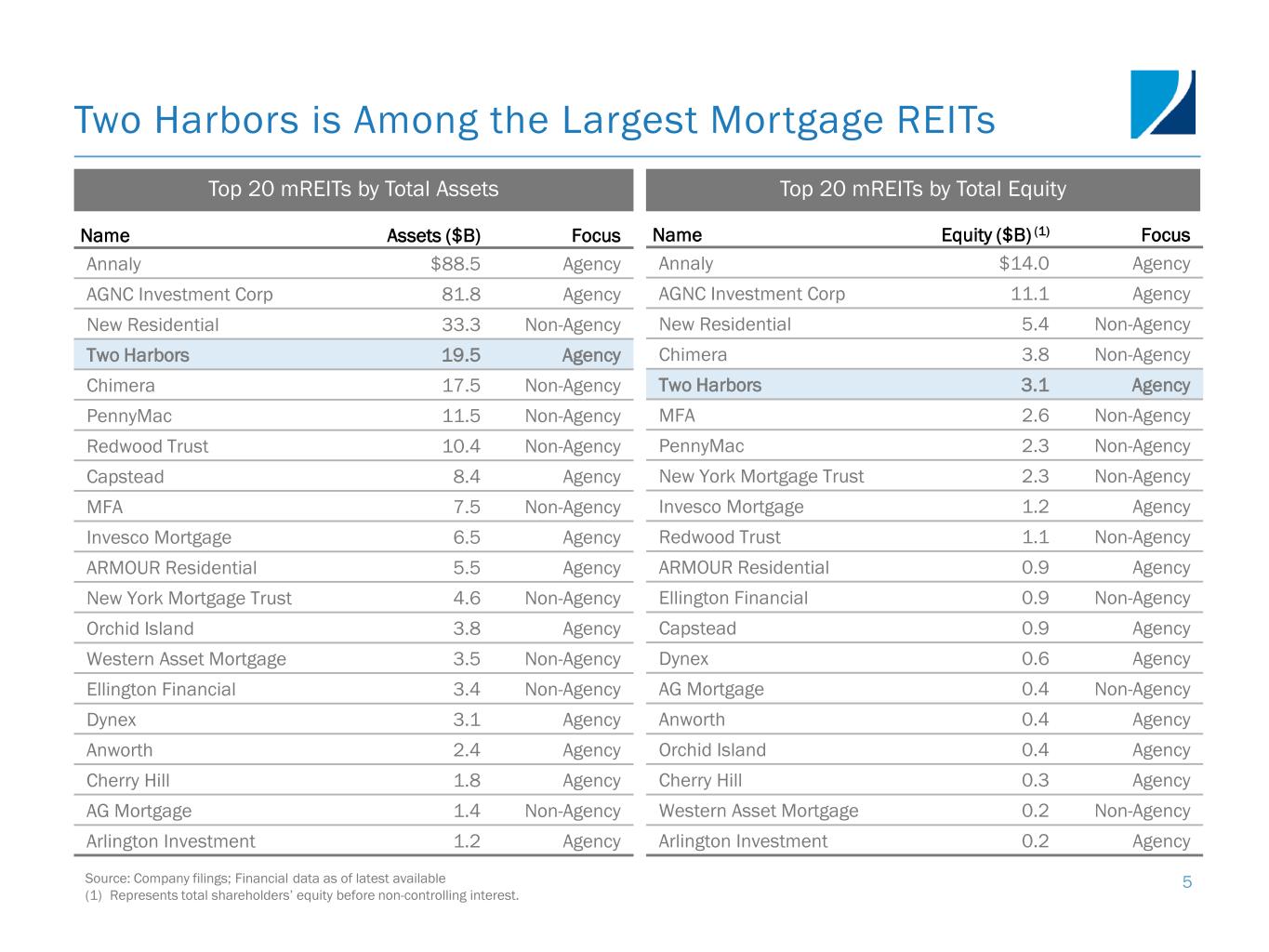 APRIL Acquires Matrix Financial Services Corp. 20202009 201720132011 2018 Company Overview and History • Unique strategy of pairing Agency RMBS with Agency mortgage servicing rights (MSR) • Robust and sophisticated risk management practices • Dedicated to stockholder engagement and transparency • Committed to highest standards of corporate governance OCTOBER Public listing via merger with Capitol Acquisition Corp. MARCH Issues debut $144mm preferred stock JUNE IPO of Granite Point Mortgage Trust JULY Acquires CYS Investments JANUARY Issues $288mm debut convertible note AUGUST Completes management internalization Corporate Track Record Spans 10+ Years Foundations of Two Harbors’ Philosophy DECEMBER IPO of Silver Bay Realty Trust Corp. FEBRUARY Moves to NYSE listing from small-cap NYSE Amex $124 million of total equity $3.1 billion of total equity (as of 12/31/2020) $2.1 billion common equity $1.0 billion perpetual preferred Benefits of Internalization • Substantial cost savings • Expect enhanced returns on future capital growth • Enhanced alignment with stockholders • Potential for attracting new institutional investors • Continue to be managed by experienced senior management team 4 2012