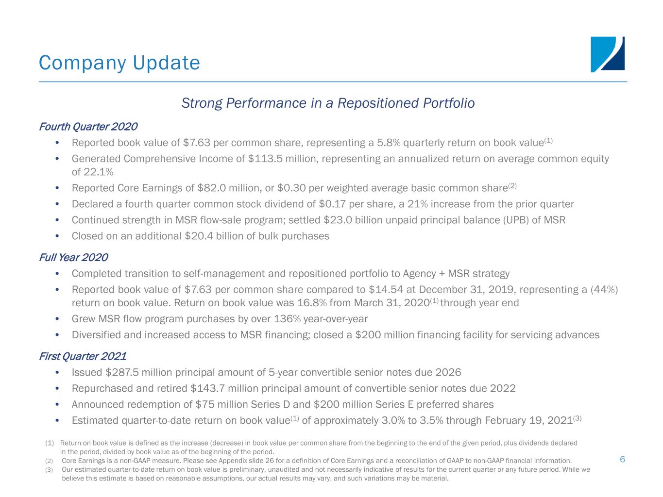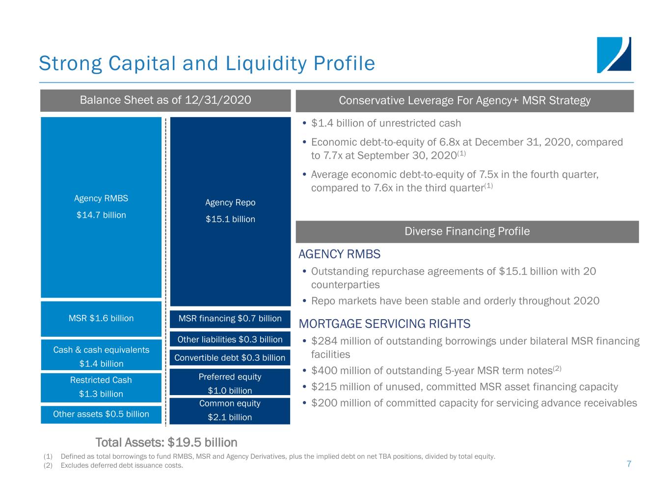 Strong Performance in a Repositioned Portfolio Fourth Quarter 2020 • Reported book value of $7.63 per common share, representing a 5.8% quarterly return on book value(1) • Generated Comprehensive Income of $113.5 million, representing an annualized return on average common equity of 22.1% • Reported Core Earnings of $82.0 million, or $0.30 per weighted average basic common share(2) • Declared a fourth quarter common stock dividend of $0.17 per share, a 21% increase from the prior quarter • Continued strength in MSR flow-sale program; settled $23.0 billion unpaid principal balance (UPB) of MSR • Closed on an additional $20.4 billion of bulk purchases Full Year 2020 • Completed transition to self-management and repositioned portfolio to Agency + MSR strategy • Reported book value of $7.63 per common share compared to $14.54 at December 31, 2019, representing a (44%) return on book value. Return on book value was 16.8% from March 31, 2020(1) through year end • Grew MSR flow program purchases by over 136% year-over-year • Diversified and increased access to MSR financing; closed a $200 million financing facility for servicing advances First Quarter 2021 • Issued $287.5 million principal amount of 5-year convertible senior notes due 2026 • Repurchased and retired $143.7 million principal amount of convertible senior notes due 2022 • Announced redemption of $75 million Series D and $200 million Series E preferred shares • Estimated quarter-to-date return on book value(1) of approximately 3.0% to 3.5% through February 19, 2021(3) 6 (1) Return on book value is defined as the increase (decrease) in book value per common share from the beginning to the end of the given period, plus dividends declared in the period, divided by book value as of the beginning of the period. (2) Core Earnings is a non-GAAP measure. Please see Appendix slide 26 for a definition of Core Earnings and a reconciliation of GAAP to non-GAAP financial information. (3) Our estimated quarter-to-date return on book value is preliminary, unaudited and not necessarily indicative of results for the current quarter or any future period. While we believe this estimate is based on reasonable assumptions, our actual results may vary, and such variations may be material. Company Update