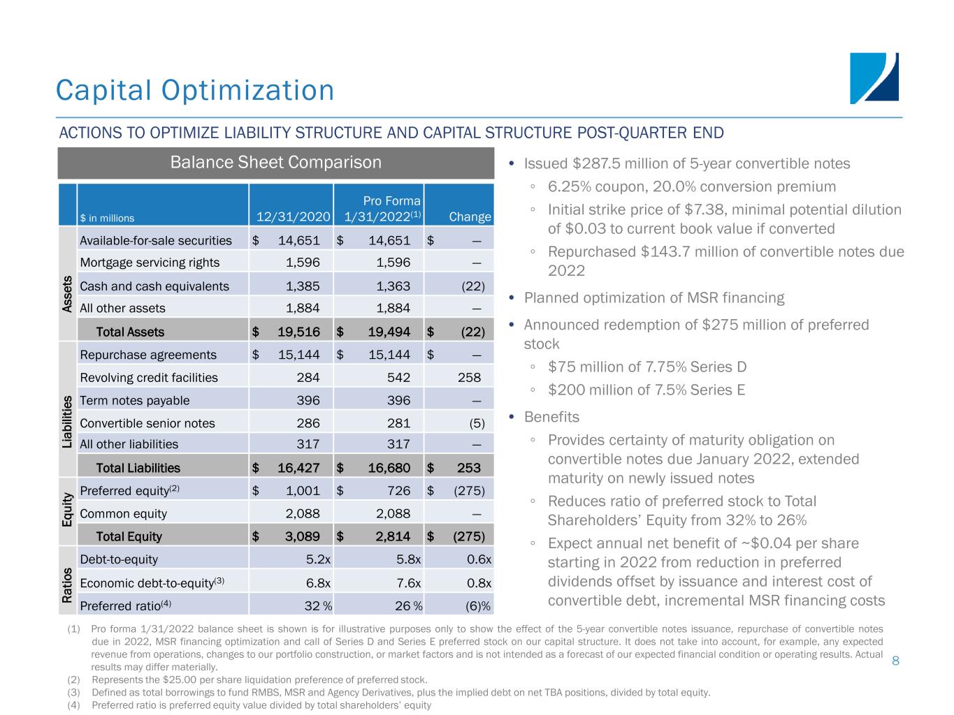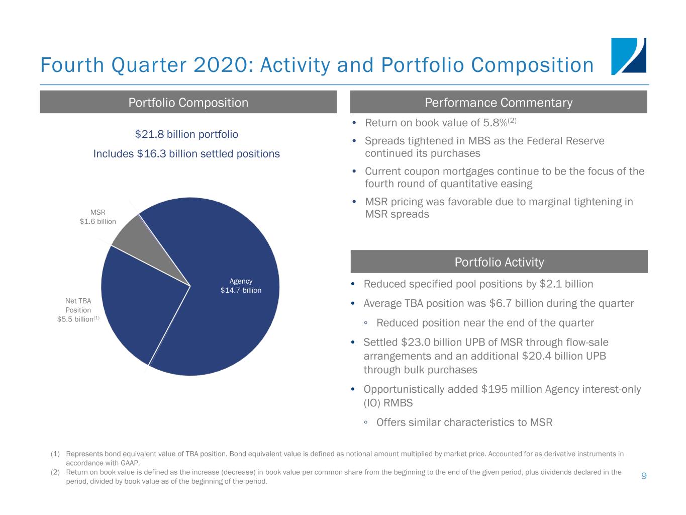 • Issued $287.5 million of 5-year convertible notes ◦ 6.25% coupon, 20.0% conversion premium ◦ Initial strike price of $7.38, minimal potential dilution of $0.03 to current book value if converted ◦ Repurchased $143.7 million of convertible notes due 2022 • Planned optimization of MSR financing • Announced redemption of $275 million of preferred stock ◦ $75 million of 7.75% Series D ◦ $200 million of 7.5% Series E • Benefits ◦ Provides certainty of maturity obligation on convertible notes due January 2022, extended maturity on newly issued notes ◦ Reduces ratio of preferred stock to Total Shareholders’ Equity from 32% to 26% ◦ Expect annual net benefit of ~$0.04 per share starting in 2022 from reduction in preferred dividends offset by issuance and interest cost of convertible debt, incremental MSR financing costs 8 Balance Sheet Comparison $ in millions 12/31/2020 Pro Forma 1/31/2022(1) Change As se ts Available-for-sale securities $ 14,651 $ 14,651 $ — Mortgage servicing rights 1,596 1,596 — Cash and cash equivalents 1,385 1,363 (22) All other assets 1,884 1,884 — Total Assets $ 19,516 $ 19,494 $ (22) Li ab ili tie s Repurchase agreements $ 15,144 $ 15,144 $ — Revolving credit facilities 284 542 258 Term notes payable 396 396 — Convertible senior notes 286 281 (5) All other liabilities 317 317 — Total Liabilities $ 16,427 $ 16,680 $ 253 Eq ui ty Preferred equity (2) $ 1,001 $ 726 $ (275) Common equity 2,088 2,088 — Total Equity $ 3,089 $ 2,814 $ (275) R at io s Debt-to-equity 5.2x 5.8x 0.6x Economic debt-to-equity(3) 6.8x 7.6x 0.8x Preferred ratio(4) 32 % 26 % (6)% ACTIONS TO OPTIMIZE LIABILITY STRUCTURE AND CAPITAL STRUCTURE POST-QUARTER END (1) Pro forma 1/31/2022 balance sheet is shown is for illustrative purposes only to show the effect of the 5-year convertible notes issuance, repurchase of convertible notes due in 2022, MSR financing optimization and call of Series D and Series E preferred stock on our capital structure. It does not take into account, for example, any expected revenue from operations, changes to our portfolio construction, or market factors and is not intended as a forecast of our expected financial condition or operating results. Actual results may differ materially. (2) Represents the $25.00 per share liquidation preference of preferred stock. (3) Defined as total borrowings to fund RMBS, MSR and Agency Derivatives, plus the implied debt on net TBA positions, divided by total equity. (4) Preferred ratio is preferred equity value divided by total shareholders’ equity Capital Optimization