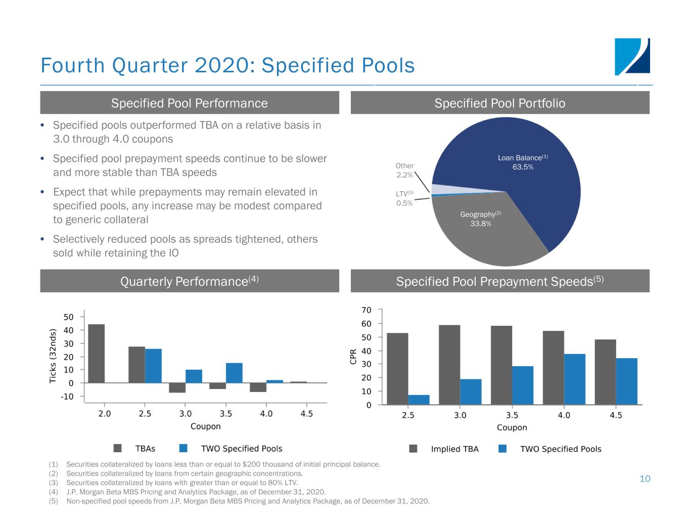 9 $21.8 billion portfolio Includes $16.3 billion settled positions (1) Represents bond equivalent value of TBA position. Bond equivalent value is defined as notional amount multiplied by market price. Accounted for as derivative instruments in accordance with GAAP. (2) Return on book value is defined as the increase (decrease) in book value per common share from the beginning to the end of the given period, plus dividends declared in the period, divided by book value as of the beginning of the period. Agency $14.7 billion MSR $1.6 billion Net TBA Position $5.5 billion(1) Fourth Quarter 2020: Activity and Portfolio Composition Performance Commentary • Return on book value of 5.8%(2) • Spreads tightened in MBS as the Federal Reserve continued its purchases • Current coupon mortgages continue to be the focus of the fourth round of quantitative easing • MSR pricing was favorable due to marginal tightening in MSR spreads Portfolio Activity • Reduced specified pool positions by $2.1 billion • Average TBA position was $6.7 billion during the quarter ◦ Reduced position near the end of the quarter • Settled $23.0 billion UPB of MSR through flow-sale arrangements and an additional $20.4 billion UPB through bulk purchases • Opportunistically added $195 million Agency interest-only (IO) RMBS ◦ Offers similar characteristics to MSR Portfolio Composition