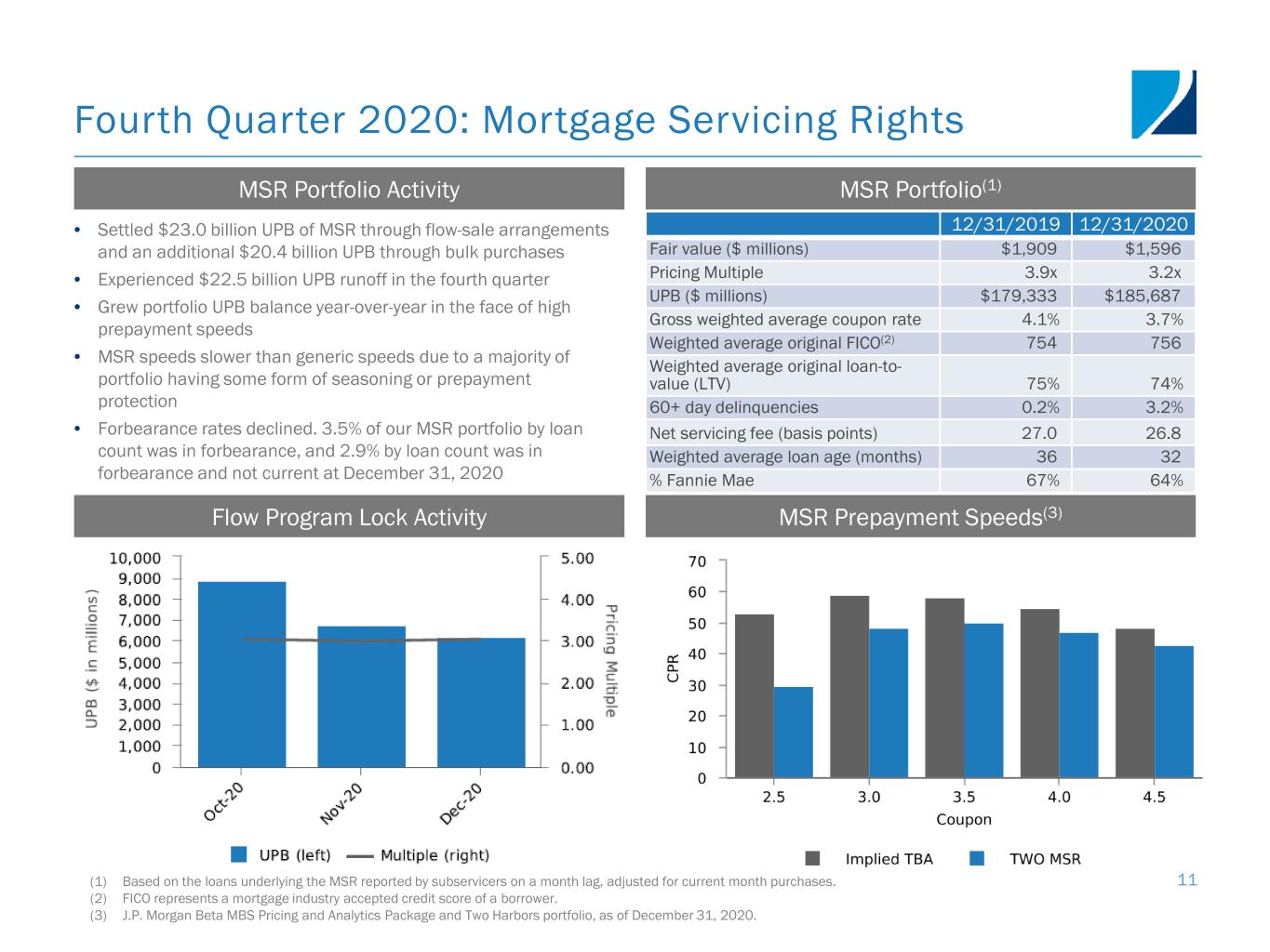 (1) Securities collateralized by loans less than or equal to $200 thousand of initial principal balance. (2) Securities collateralized by loans from certain geographic concentrations. (3) Securities collateralized by loans with greater than or equal to 80% LTV. (4) J.P. Morgan Beta MBS Pricing and Analytics Package, as of December 31, 2020. (5) Non-specified pool speeds from J.P. Morgan Beta MBS Pricing and Analytics Package, as of December 31, 2020. Other 2.2% 10 Loan Balance(1) 63.5% Geography(2) 33.8% LTV(3) 0.5% Fourth Quarter 2020: Specified Pools Quarterly Performance(4) Specified Pool Prepayment Speeds(5) Specified Pool Performance Specified Pool Portfolio • Specified pools outperformed TBA on a relative basis in 3.0 through 4.0 coupons • Specified pool prepayment speeds continue to be slower and more stable than TBA speeds • Expect that while prepayments may remain elevated in specified pools, any increase may be modest compared to generic collateral • Selectively reduced pools as spreads tightened, others sold while retaining the IO