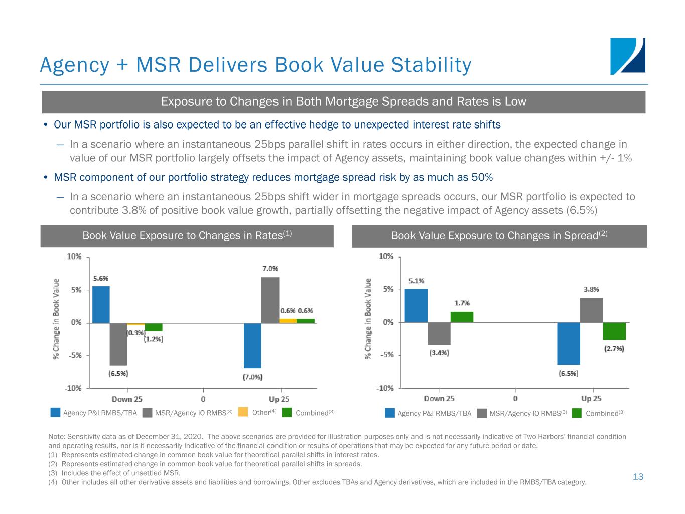 The Agency + MSR Advantage • Portfolio constructed by pairing Agency RMBS with Agency MSR ― MSR portfolio is sourced through strategic partnerships with a set of highly curated flow sellers and opportunistic bulk purchases ― Engage a small number of high-quality subservicers to maximize the effectiveness of our in-house oversight and compliance capabilities • Agency + MSR strategy has a higher return potential with lower mortgage spread risk than a pure-play RMBS portfolio, and the ability to deliver consistent, more stable returns across rate environments ― MSR is an effective hedge to RMBS rate and spread risk o MSR values increase when rates increase and decrease when rates decrease o MSR values increase when mortgage spreads increase and decrease when mortgage spreads decrease ― In summary, MSR has similar risks to a short pool/TBA position (1) The effective coupon positioning for MSR is an internally calculated exposure that represents the current coupon equivalents of our MSR assets. Data as of December 31, 2020. Includes the effect of unsettled MSR. Differentiated Investment Strategy Agency P&I RMBS/TBA MSR/Agency IO RMBS (1) Combined(1)+ = 12 Position as of September 30, 2020