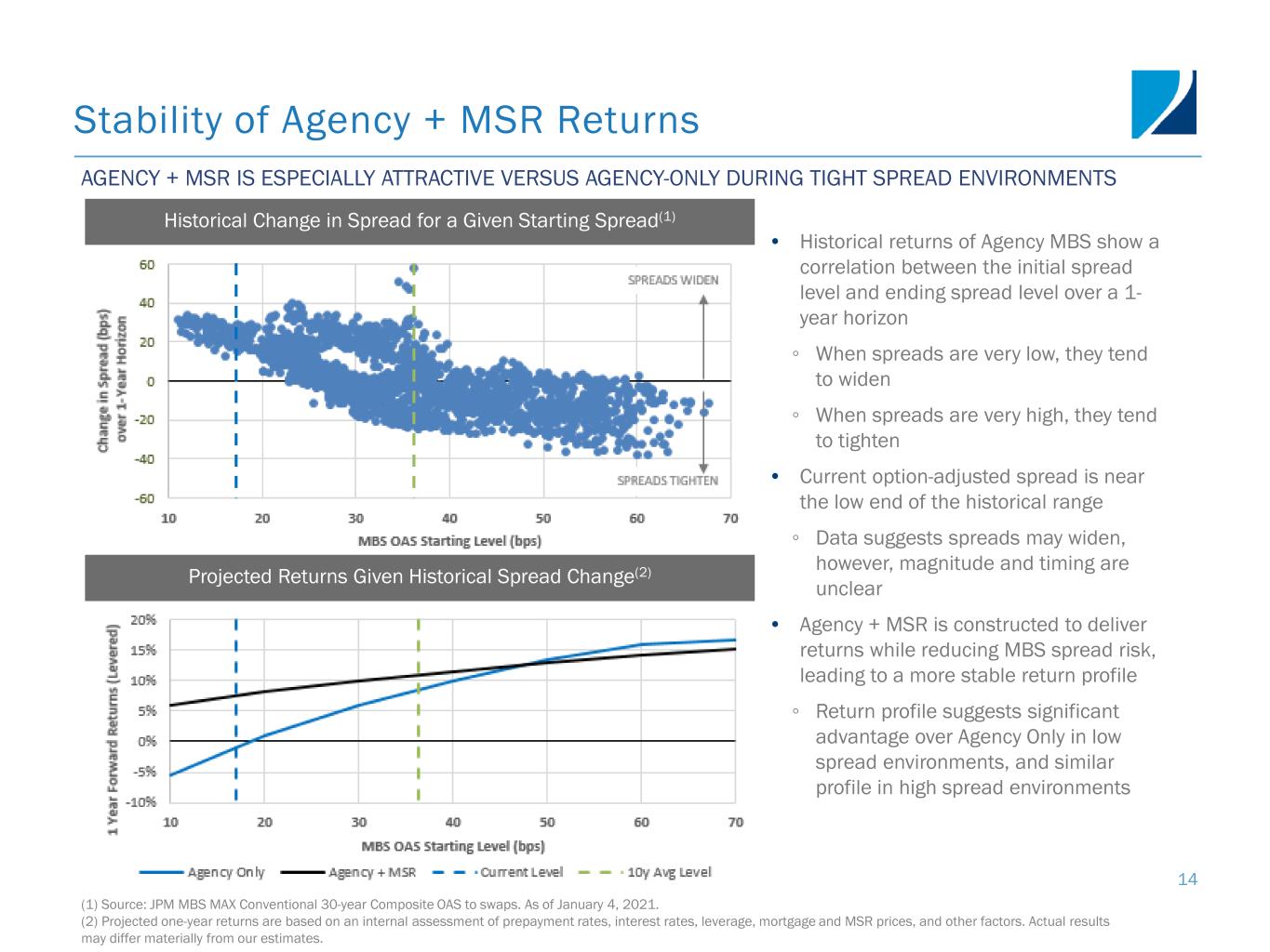 • Our MSR portfolio is also expected to be an effective hedge to unexpected interest rate shifts ― In a scenario where an instantaneous 25bps parallel shift in rates occurs in either direction, the expected change in value of our MSR portfolio largely offsets the impact of Agency assets, maintaining book value changes within +/- 1% • MSR component of our portfolio strategy reduces mortgage spread risk by as much as 50% ― In a scenario where an instantaneous 25bps shift wider in mortgage spreads occurs, our MSR portfolio is expected to contribute 3.8% of positive book value growth, partially offsetting the negative impact of Agency assets (6.5%) Note: Sensitivity data as of December 31, 2020. The above scenarios are provided for illustration purposes only and is not necessarily indicative of Two Harbors’ financial condition and operating results, nor is it necessarily indicative of the financial condition or results of operations that may be expected for any future period or date. (1) Represents estimated change in common book value for theoretical parallel shifts in interest rates. (2) Represents estimated change in common book value for theoretical parallel shifts in spreads. (3) Includes the effect of unsettled MSR. (4) Other includes all other derivative assets and liabilities and borrowings. Other excludes TBAs and Agency derivatives, which are included in the RMBS/TBA category. Agency + MSR Delivers Book Value Stability Book Value Exposure to Changes in Rates(1) MSR/Agency IO RMBS(3) Other(4)Agency P&I RMBS/TBA Combined(3) 13 Exposure to Changes in Both Mortgage Spreads and Rates is Low Book Value Exposure to Changes in Spread(2) MSR/Agency IO RMBS(3)Agency P&I RMBS/TBA Combined(3)
