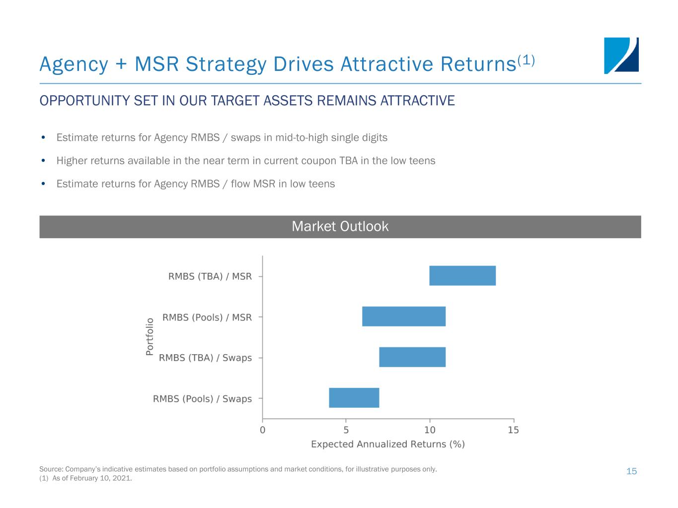 14 AGENCY + MSR IS ESPECIALLY ATTRACTIVE VERSUS AGENCY-ONLY DURING TIGHT SPREAD ENVIRONMENTS • Historical returns of Agency MBS show a correlation between the initial spread level and ending spread level over a 1- year horizon ◦ When spreads are very low, they tend to widen ◦ When spreads are very high, they tend to tighten • Current option-adjusted spread is near the low end of the historical range ◦ Data suggests spreads may widen, however, magnitude and timing are unclear • Agency + MSR is constructed to deliver returns while reducing MBS spread risk, leading to a more stable return profile ◦ Return profile suggests significant advantage over Agency Only in low spread environments, and similar profile in high spread environments Projected Returns Given Historical Spread Change(2) Historical Change in Spread for a Given Starting Spread(1) (1) Source: JPM MBS MAX Conventional 30-year Composite OAS to swaps. As of January 4, 2021. (2) Projected one-year returns are based on an internal assessment of prepayment rates, interest rates, leverage, mortgage and MSR prices, and other factors. Actual results may differ materially from our estimates. Stability of Agency + MSR Returns