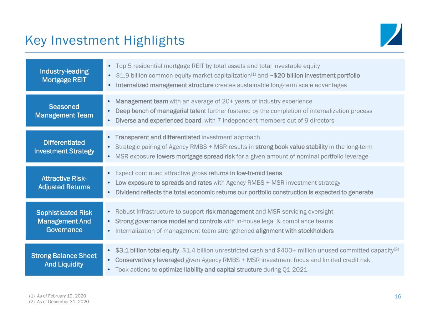 Agency + MSR Strategy Drives Attractive Returns(1) 15 OPPORTUNITY SET IN OUR TARGET ASSETS REMAINS ATTRACTIVE • Estimate returns for Agency RMBS / swaps in mid-to-high single digits • Higher returns available in the near term in current coupon TBA in the low teens • Estimate returns for Agency RMBS / flow MSR in low teens Market Outlook Source: Company’s indicative estimates based on portfolio assumptions and market conditions, for illustrative purposes only. (1) As of February 10, 2021.