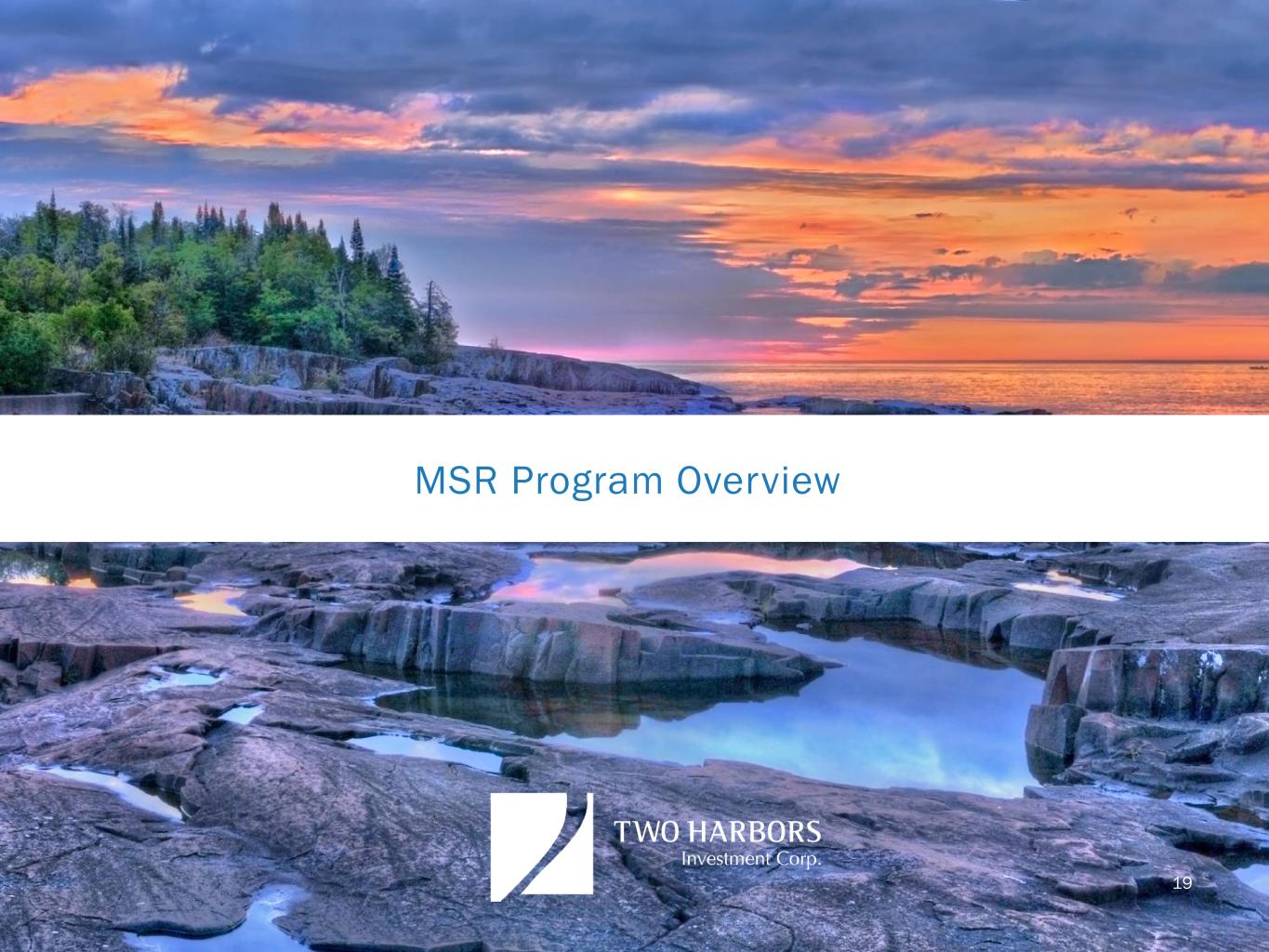 Management Team 18 • Over 25 years of experience managing portfolios of structured finance assets • 8 year tenure with Two Harbors • Appointed CEO in June 2020 • Served as Co-CIO of Two Harbors since January 2020, and prior to that, served as Co-Deputy CIO from June 2018 • Prior to joining Two Harbors in 2012, was a Managing Director at UBS AG, holding a variety of senior positions, including managing the mortgage repurchase liability risk related to over $100 billion of RMBS and whole loans issued and/or sold by UBS • B.S. in physics from the Massachusetts Institute of Technology, and M.S. and Ph.D. degrees in theoretical nuclear physics from the University of Washington Bill Greenberg Chief Executive Officer and President • Over 20 years of experience managing portfolios of structured finance assets • 10 year tenure with Two Harbors • Served as CIO of Two Harbors since June 2020, with primary responsibility for the investment and hedging strategy of the Company’s portfolio of conventional MSR and securities; previously served as Co-CIO from January 2020 and as Co-Deputy CIO from June 2018 • Prior to joining Two Harbors in 2010, held several key positions with Black River Asset Management, which was a division of Cargill, Inc. • B.A. degree in financial management from the University of St. Thomas Matt Koeppen Chief Investment Officer • Over 30 years of experience in financial management roles for public financial services companies • 9 year tenure with Two Harbors • Appointed CFO of Two Harbors in February 2019, after serving as Chief Accounting Officer since 2016 • Previously served as Corporate Controller since 2013 and as Director, Loan Accounting upon joining Two Harbors • Prior to joining Two Harbors in 2011, held leadership roles at GMAC ResCap, a global diversified real estate company • B.B.A. in Accounting from the University of North Dakota Mary Riskey Chief Financial Officer