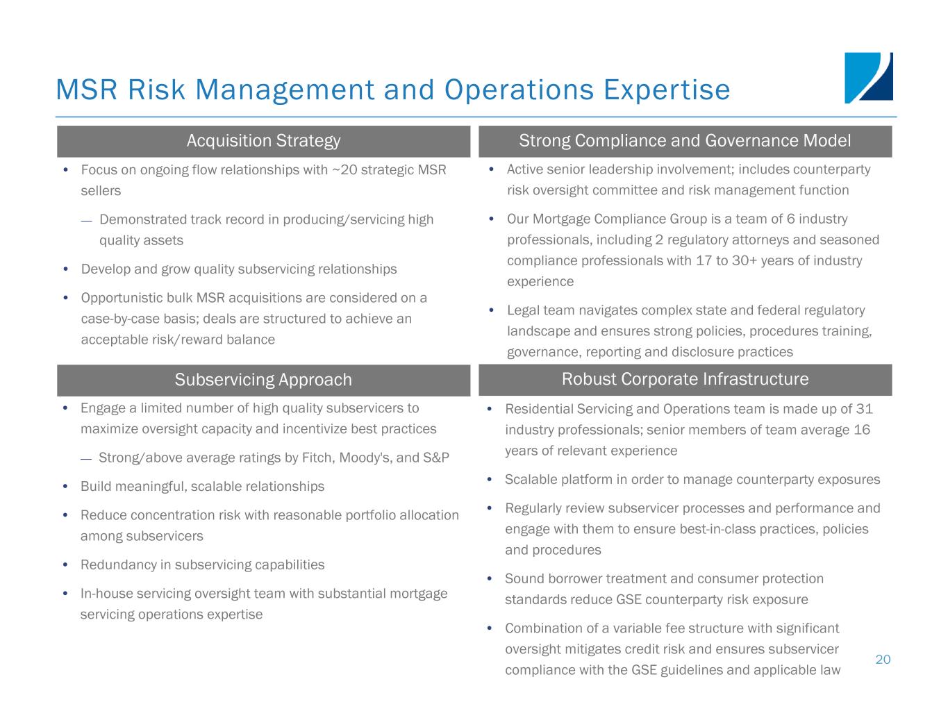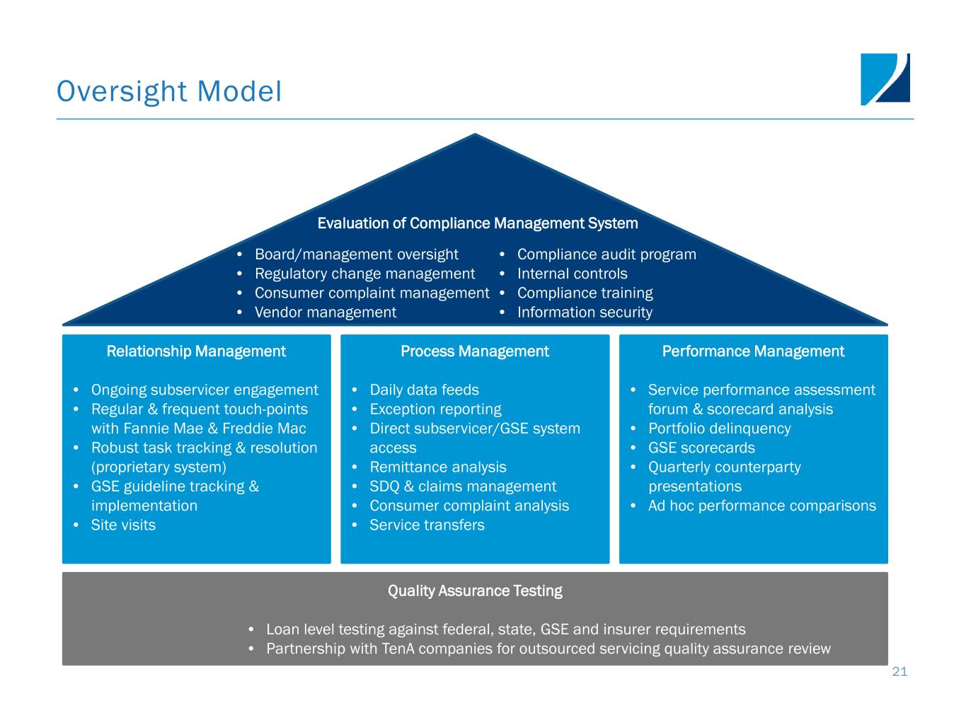 MSR Risk Management and Operations Expertise • Focus on ongoing flow relationships with ~20 strategic MSR sellers ― Demonstrated track record in producing/servicing high quality assets • Develop and grow quality subservicing relationships • Opportunistic bulk MSR acquisitions are considered on a case-by-case basis; deals are structured to achieve an acceptable risk/reward balance Robust Corporate Infrastructure • Residential Servicing and Operations team is made up of 31 industry professionals; senior members of team average 16 years of relevant experience • Scalable platform in order to manage counterparty exposures • Regularly review subservicer processes and performance and engage with them to ensure best-in-class practices, policies and procedures • Sound borrower treatment and consumer protection standards reduce GSE counterparty risk exposure • Combination of a variable fee structure with significant oversight mitigates credit risk and ensures subservicer compliance with the GSE guidelines and applicable law Acquisition Strategy 20 Subservicing Approach • Engage a limited number of high quality subservicers to maximize oversight capacity and incentivize best practices ― Strong/above average ratings by Fitch, Moody's, and S&P • Build meaningful, scalable relationships • Reduce concentration risk with reasonable portfolio allocation among subservicers • Redundancy in subservicing capabilities • In-house servicing oversight team with substantial mortgage servicing operations expertise Strong Compliance and Governance Model • Active senior leadership involvement; includes counterparty risk oversight committee and risk management function • Our Mortgage Compliance Group is a team of 6 industry professionals, including 2 regulatory attorneys and seasoned compliance professionals with 17 to 30+ years of industry experience • Legal team navigates complex state and federal regulatory landscape and ensures strong policies, procedures training, governance, reporting and disclosure practices