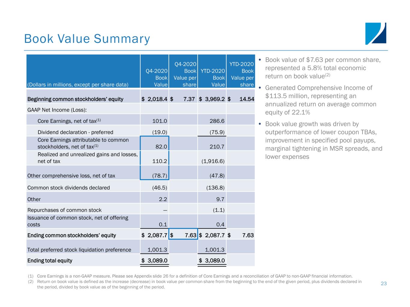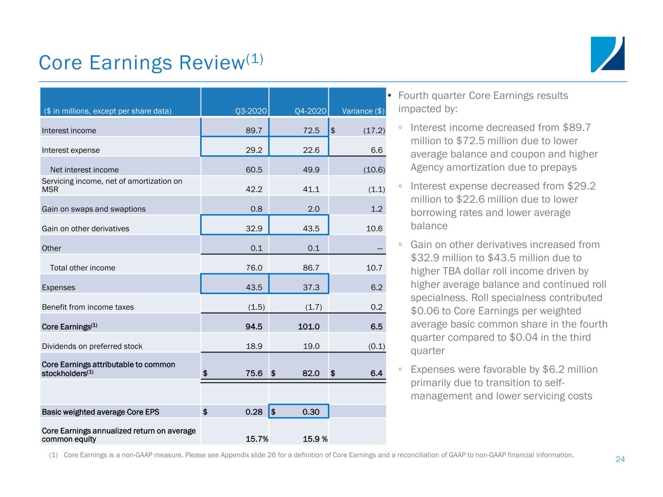 • Book value of $7.63 per common share, represented a 5.8% total economic return on book value(2) • Generated Comprehensive Income of $113.5 million, representing an annualized return on average common equity of 22.1% • Book value growth was driven by outperformance of lower coupon TBAs, improvement in specified pool payups, marginal tightening in MSR spreads, and lower expenses (Dollars in millions, except per share data) Q4-2020 Book Value Q4-2020 Book Value per share YTD-2020 Book Value YTD-2020 Book Value per share Beginning common stockholders’ equity $ 2,018.4 $ 7.37 $ 3,969.2 $ 14.54 GAAP Net Income (Loss): Core Earnings, net of tax(1) 101.0 286.6 Dividend declaration - preferred (19.0) (75.9) Core Earnings attributable to common stockholders, net of tax(1) 82.0 210.7 Realized and unrealized gains and losses, net of tax 110.2 (1,916.6) Other comprehensive loss, net of tax (78.7) (47.8) Common stock dividends declared (46.5) (136.8) Other 2.2 9.7 Repurchases of common stock — (1.1) Issuance of common stock, net of offering costs 0.1 0.4 Ending common stockholders’ equity $ 2,087.7 $ 7.63 $ 2,087.7 $ 7.63 Total preferred stock liquidation preference 1,001.3 1,001.3 Ending total equity $ 3,089.0 $ 3,089.0 23 (1) Core Earnings is a non-GAAP measure. Please see Appendix slide 26 for a definition of Core Earnings and a reconciliation of GAAP to non-GAAP financial information. (2) Return on book value is defined as the increase (decrease) in book value per common share from the beginning to the end of the given period, plus dividends declared in the period, divided by book value as of the beginning of the period. Book Value Summary